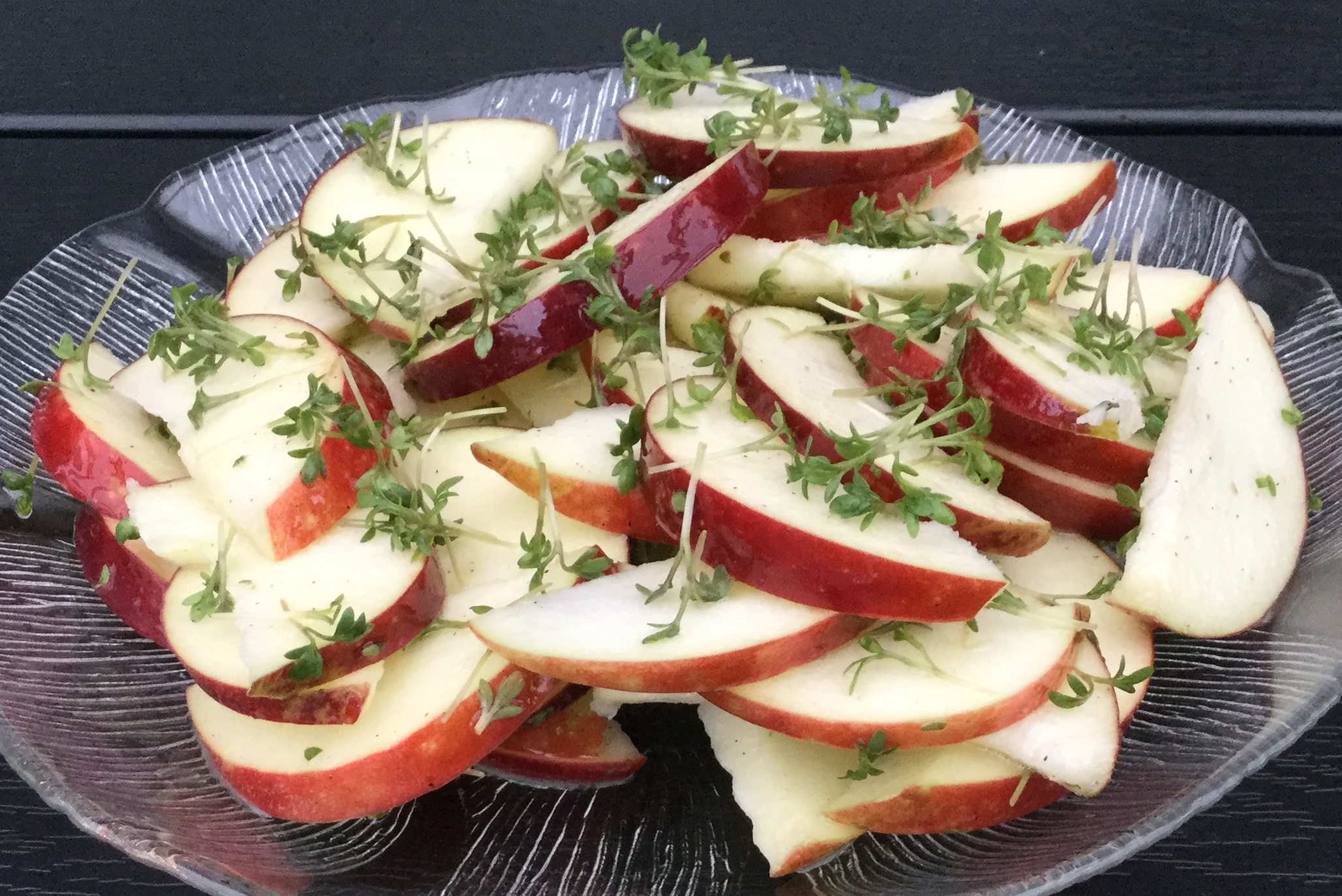 Rør olie, eddike, salt og peber sammen i en skål. Skyl æblerne og skær dem i tynde både. Vend æbler og dressing sammen. Pynt med karse.