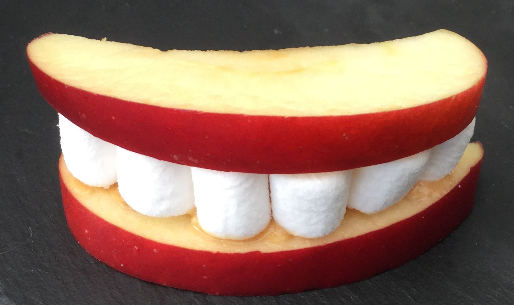 Smør lidt peanutbutter på den ene side af æblebådene. Sæt skumfiduserne oven på peanutbutteret på en af æblebådene. Læg den anden æblebåd på med peanutbutteret mod skumfiduserne.