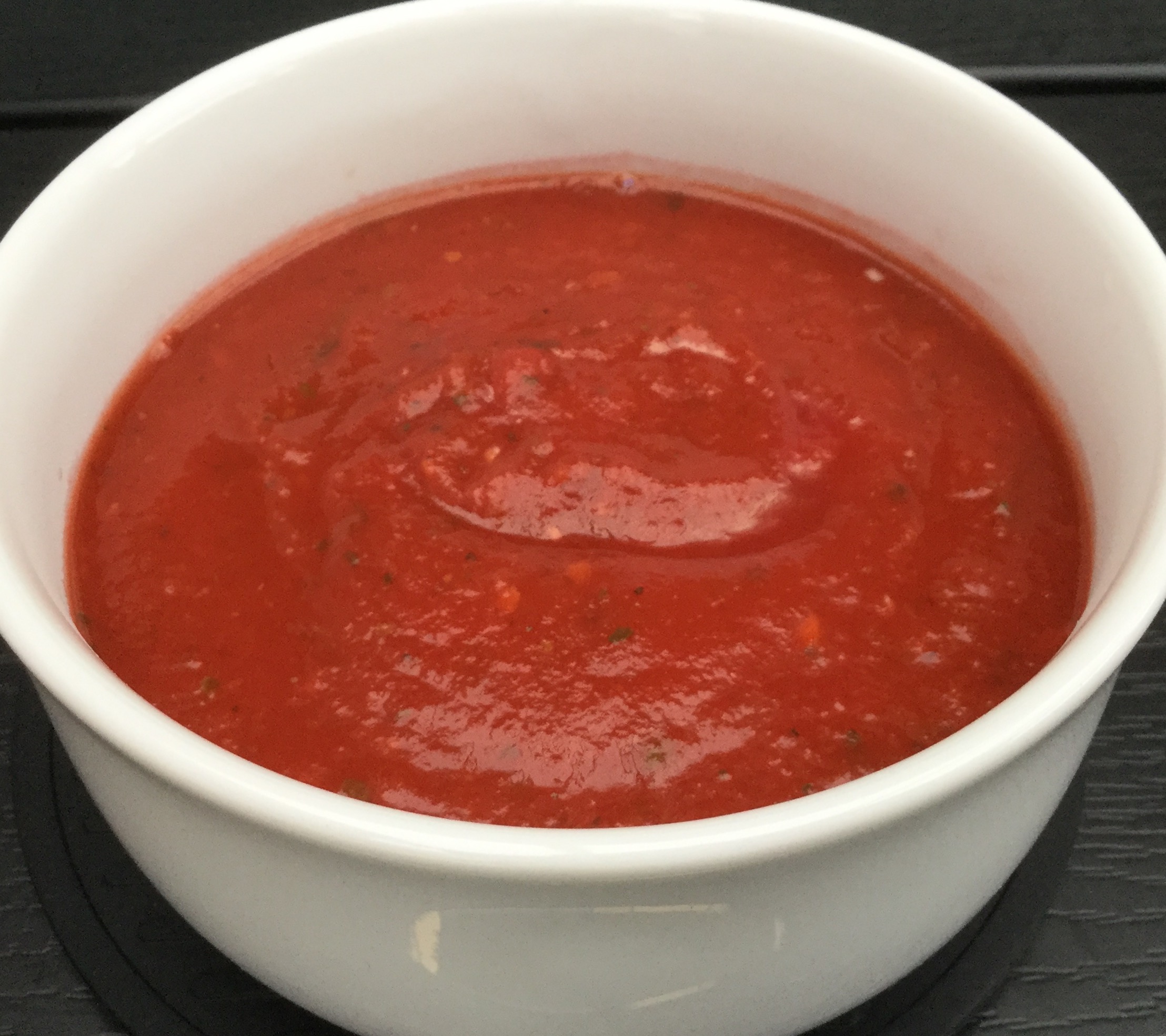 Kom de flåede tomater i en blender. Pil hvidløgsfedet og kom det i blenderen sammen med de øvrige ingredienser. Blend til alt er findelt. Kom pizzasovsen over i en gryde og lad det simre 4-5 minutter. Smag sovsen til.