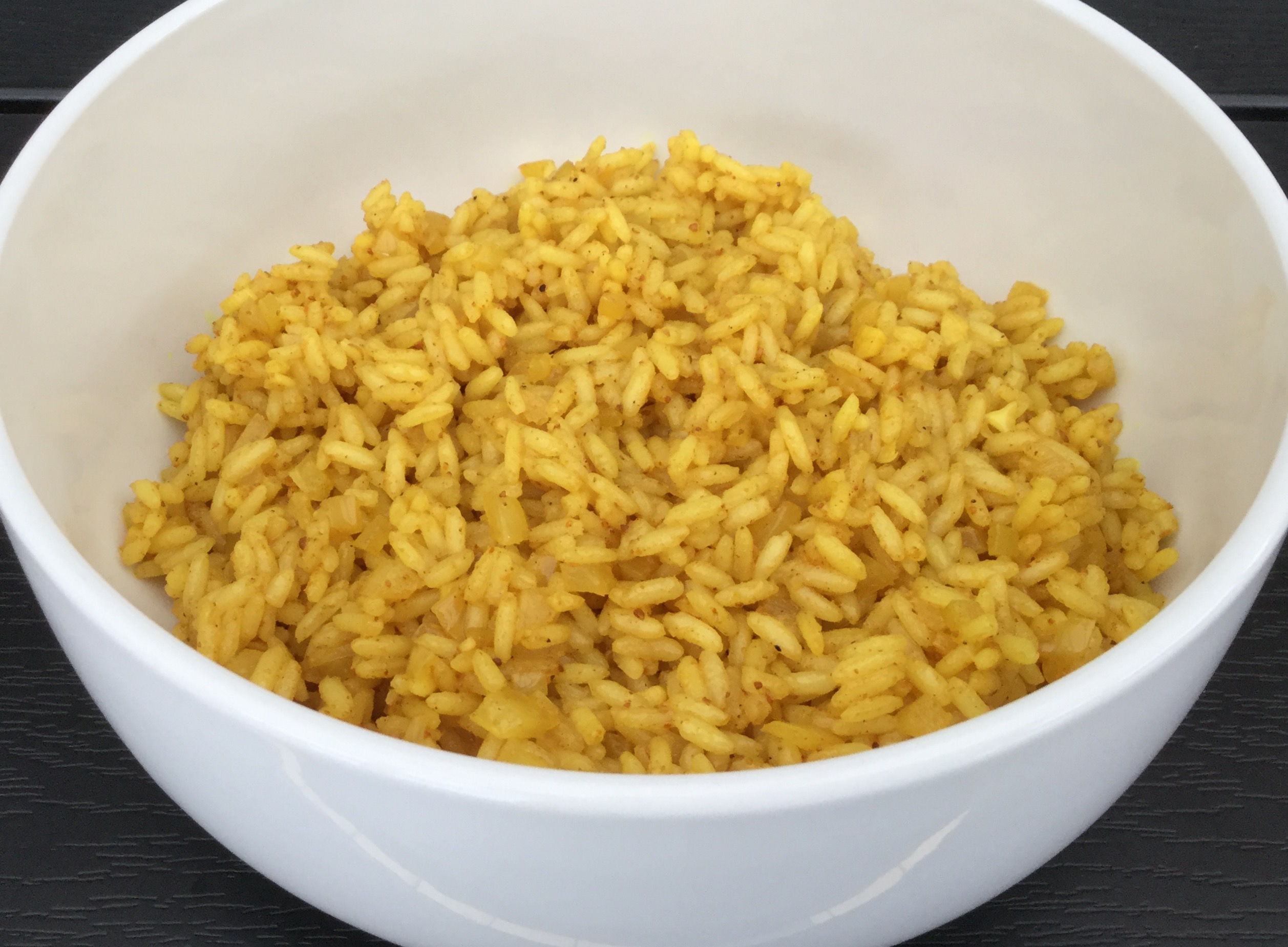 Tilsæt de kogte ris og vandet og vend rundt så krydderierne bliver fordelt. Tilsæt smørret og smag risene til. Tilsæt evt. ekstra gurkemeje for at få den gule farve.