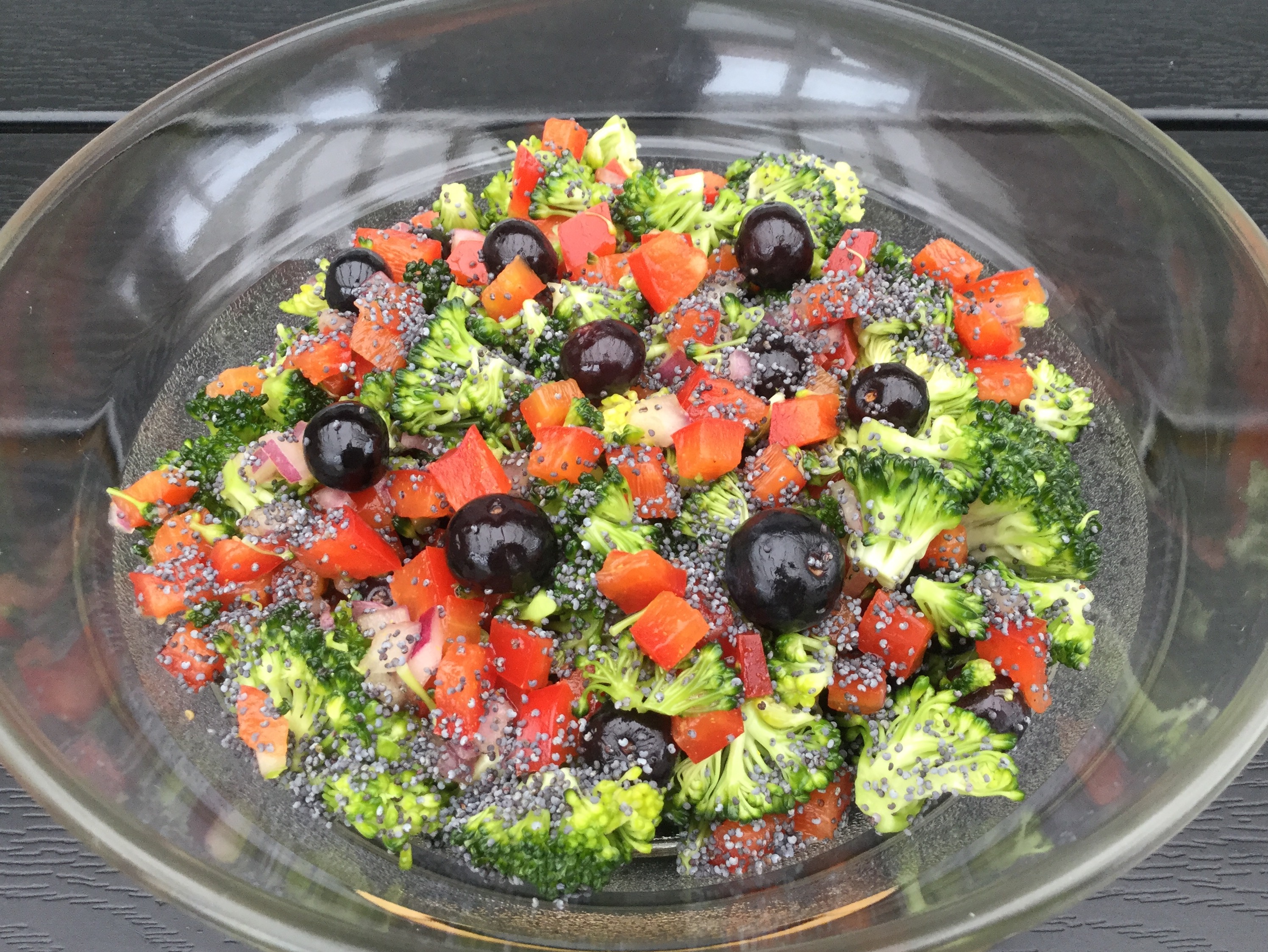 Skær broccolien i små stykker. Skær den røde peber og rødløget i små tern. Bland broccoli, rød peber, rødløg og blåbær. Hæld dressingen over salaten og vend forsigtigt rundt. Drys blå birkes over salaten og pynt med blåbær.