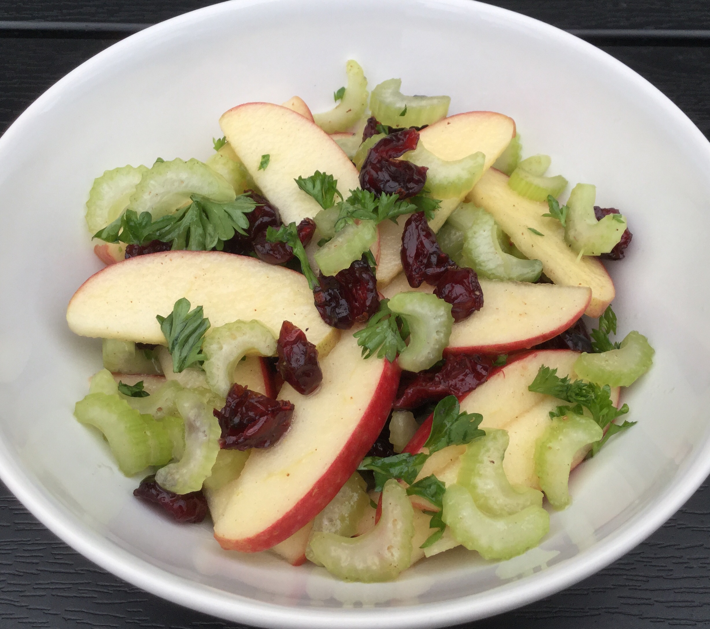 Skær bladsellerien i tynde skiver. Skær æblet i tynde både. Hak persillen. Bland bladselleri, æble, persille og tranebær. Hæld dressingen over og vend forsigtigt rundt i salaten.