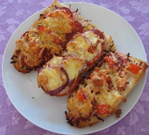 Efter skinkestrimlerne, kom 3 skiveskåret tomat oven på, samt 3 rødløg ringe, og derefter osten