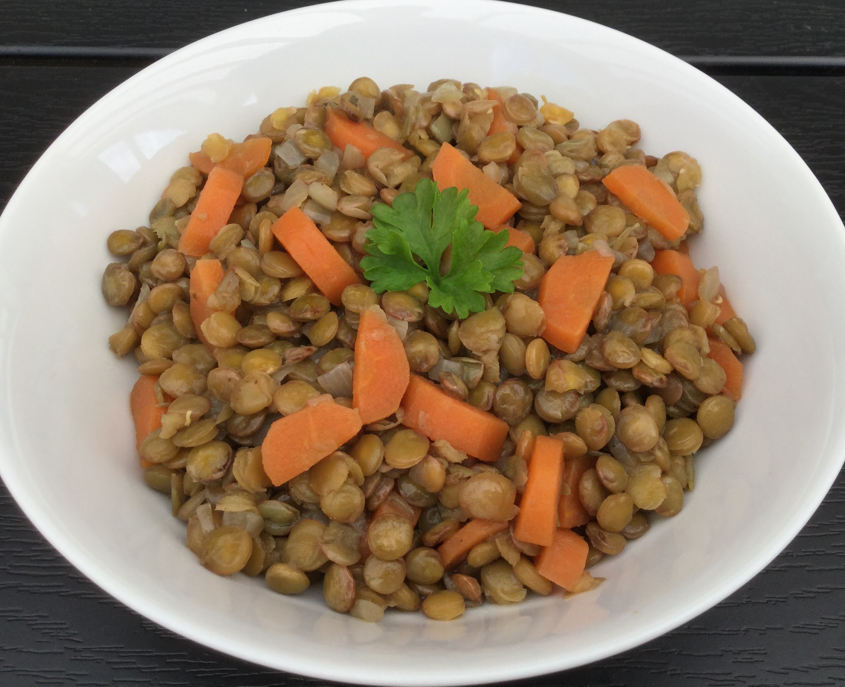 Skær løg, hvidløg og gulerødder i små tern. Svits løg og hvidløg i olien. Kom gulerødder og linser i og svits dem med. Kom bouillonen på og kog under låg i 20-25 minutter. Smag til med salt og peber.