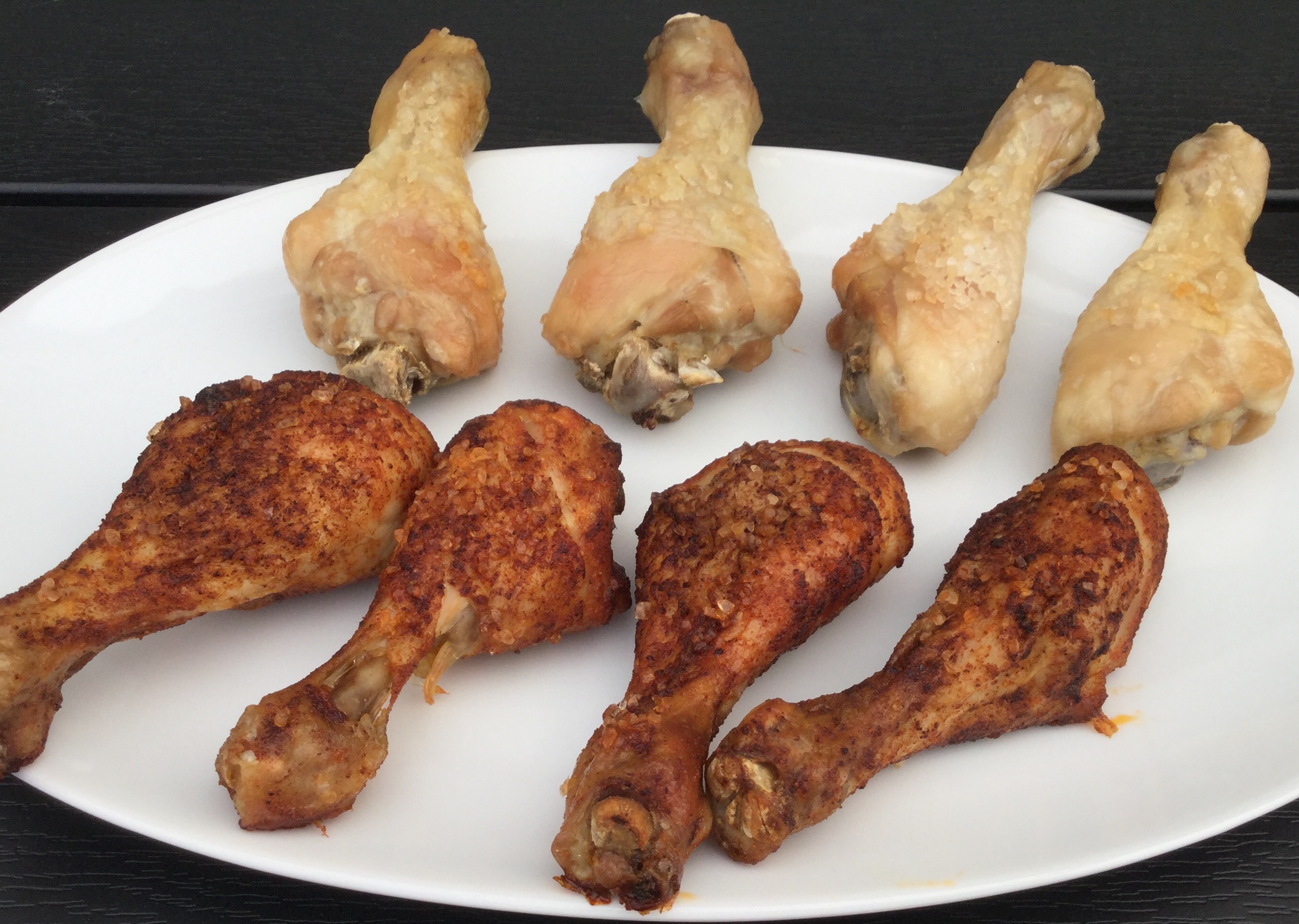 Rør olie sammen med paprika og pensl det på kyllingelårene. Drys med salt.