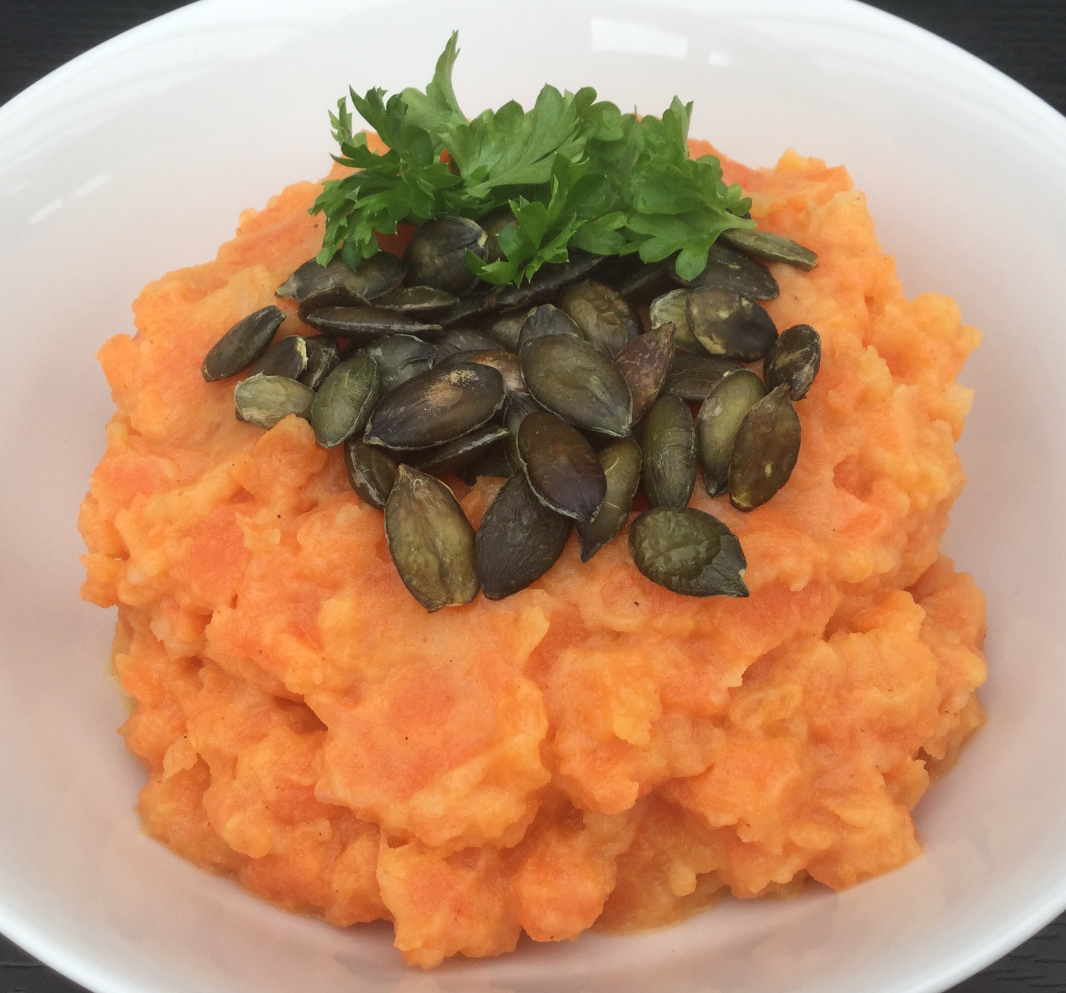 Græskarkernerne ristes på en tør pande og drysses over gulerodsmosen sammen med lidt friskhakket persille.