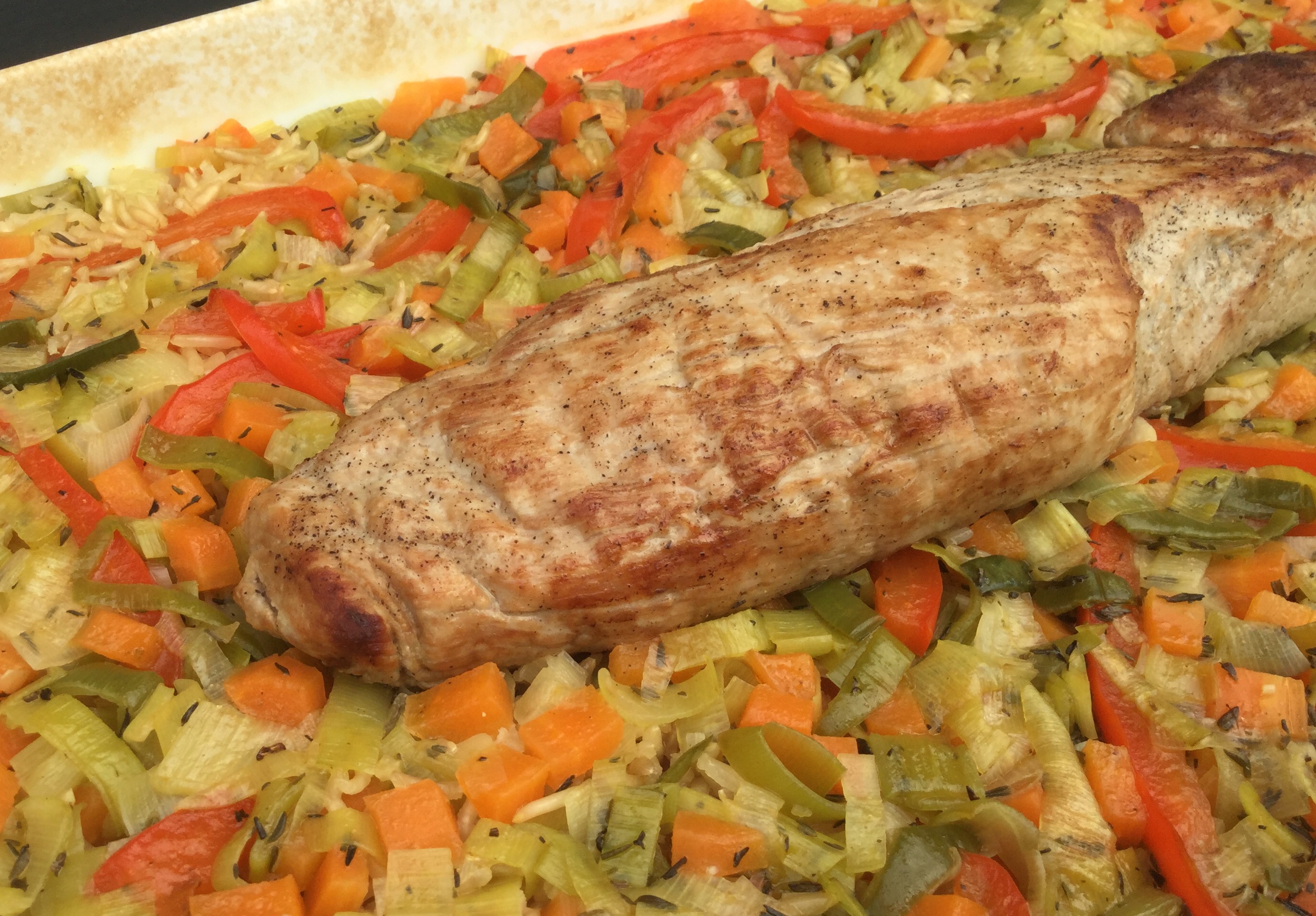 Læg mørbraden oven på ris og grøntsager.