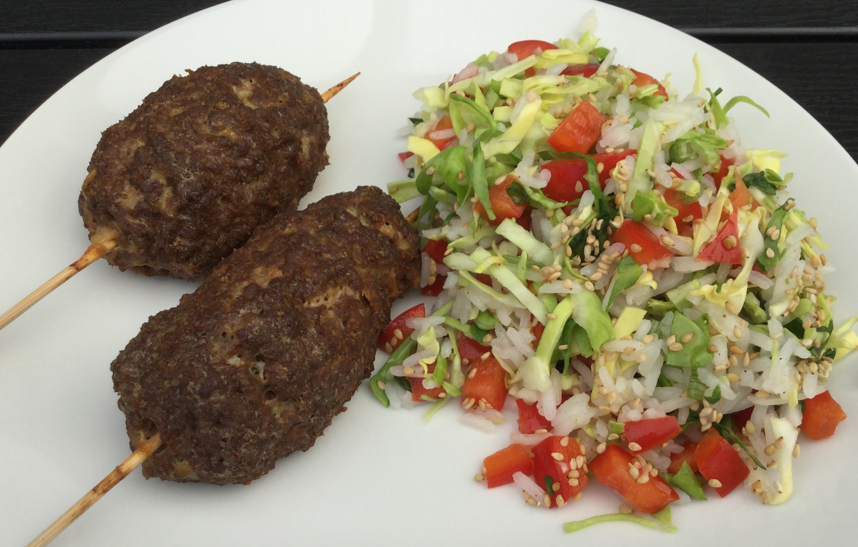 Rør farsen med æg, mayonnaise og taco krydderi. Lad farsen stå og trække lidt. Form farsen til små pølser og stik træspyd i. Læg spyddene på bagepapir og bag dem i ovnen ved 200 grader i ca. 20 minutter.
