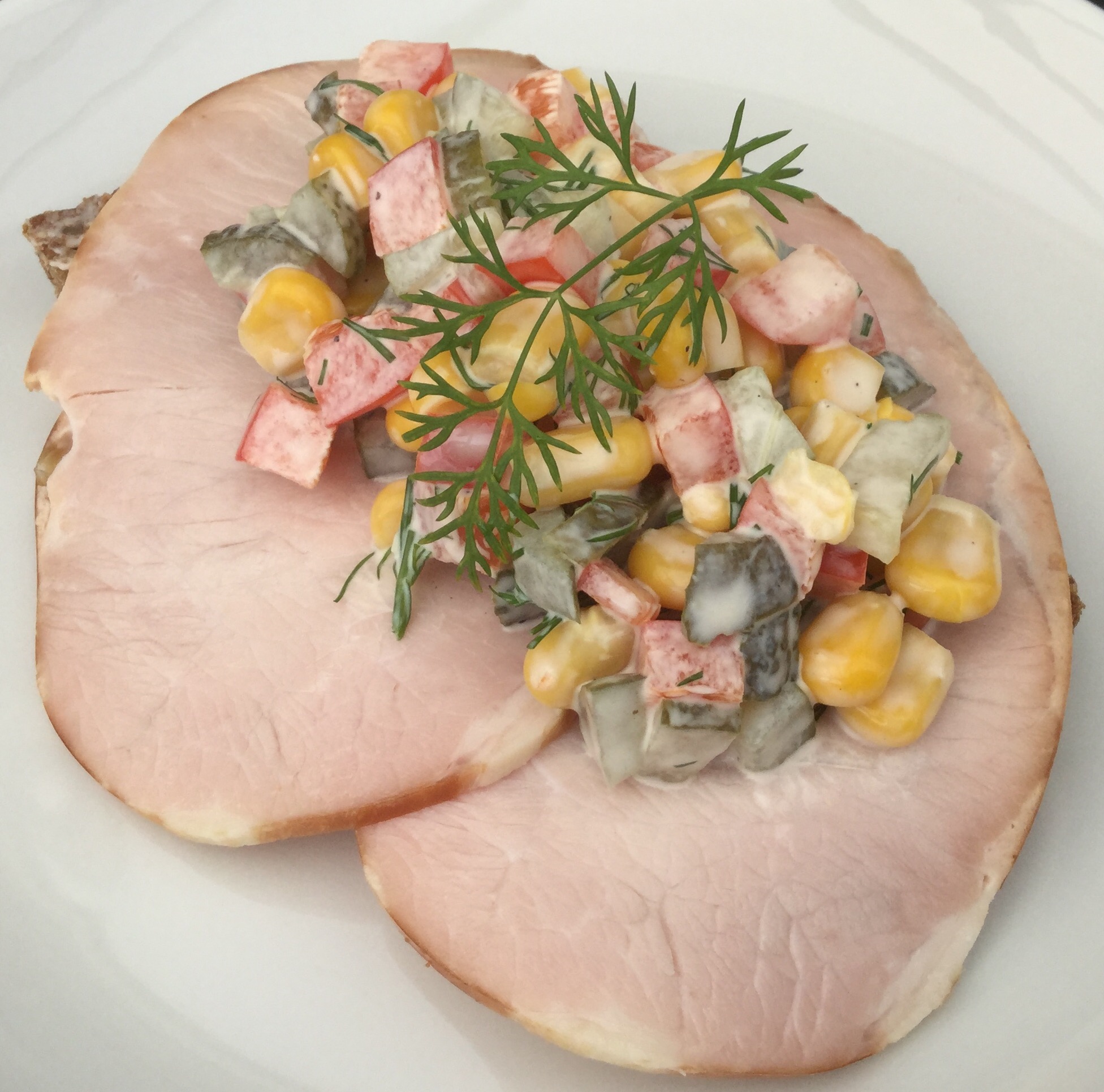 Smør rugbrødsskiven og læg hamburgerryggen på. Kom majssalat ovenpå. Pynt med dild.