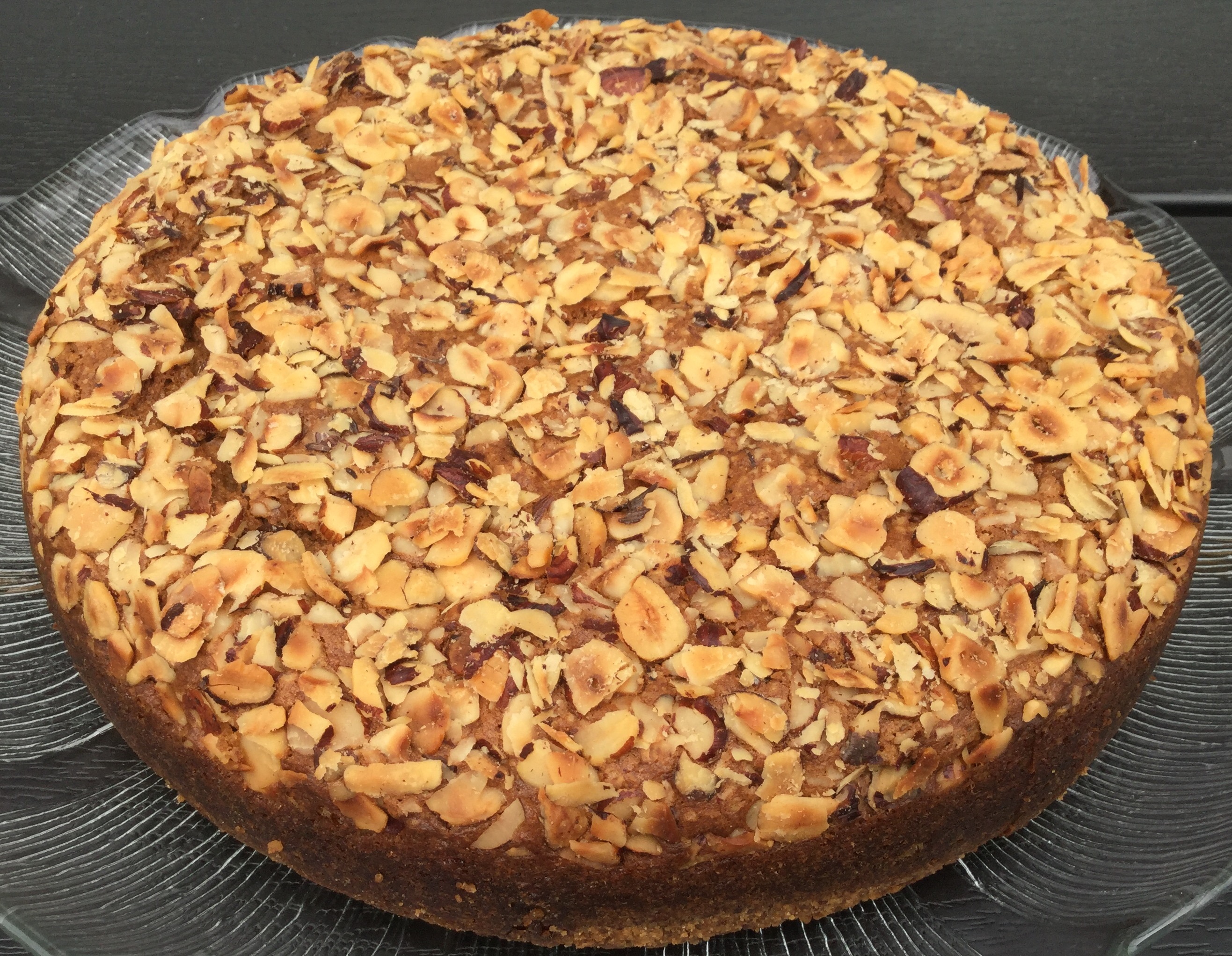Smuldr mel, smør og farin sammen. Læg godt 1/3-del af blandingen i en smurt springform (ca. 22 cm). Rør resten af smuldredejen i skålen med æg og creme fraiche. Tilsæt kanel, natron og appelsinskal. Hæld blandingen over smuldredejen og drys hasselnøddeflager over. Bag kagen ved 180 grader i ca. 50 minutter.