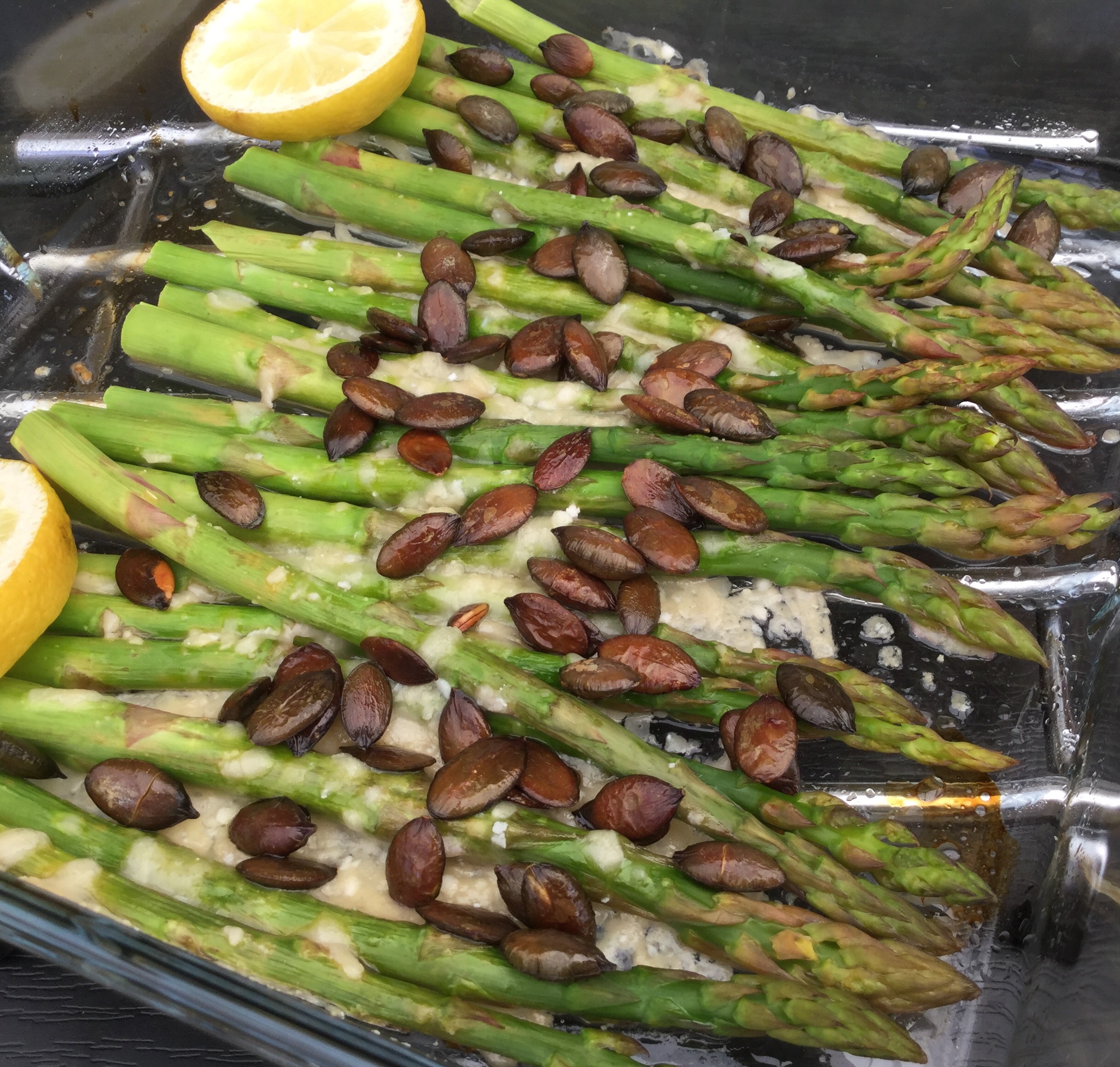 Smør et ovnfast fad med lidt olie. Knæk den træede ende af aspargesene og læg dem i fadet. Skær 2 tykke skiver af citronen og pres saften over aspargesene. Læg citronskiverne i hjørnet af fadet. Riv parmesanen groft og drys den over. Bag aspargesene ved 200 grader i ca. 10-12 minutter til osten er smeltet. Drys de ristede græskarkerner over.