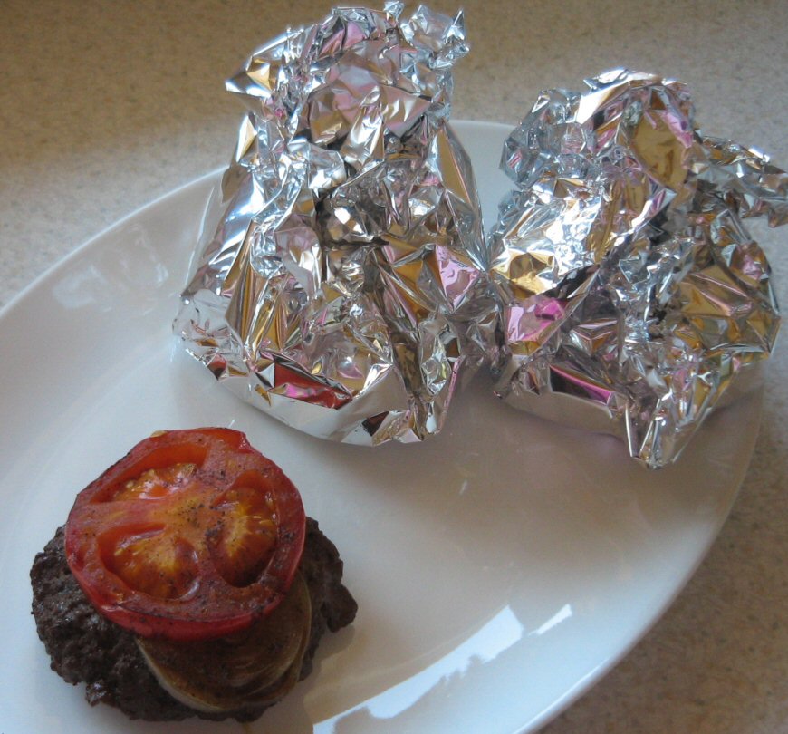 Farsen formes til 4 bøffer. Læg hver bøf på et stykke stanniol. Læg en skive løg og en skive tomat på hver bøf. Drys med salt og peber plus et skvat sojasovs. Stanniolen samles foroven.