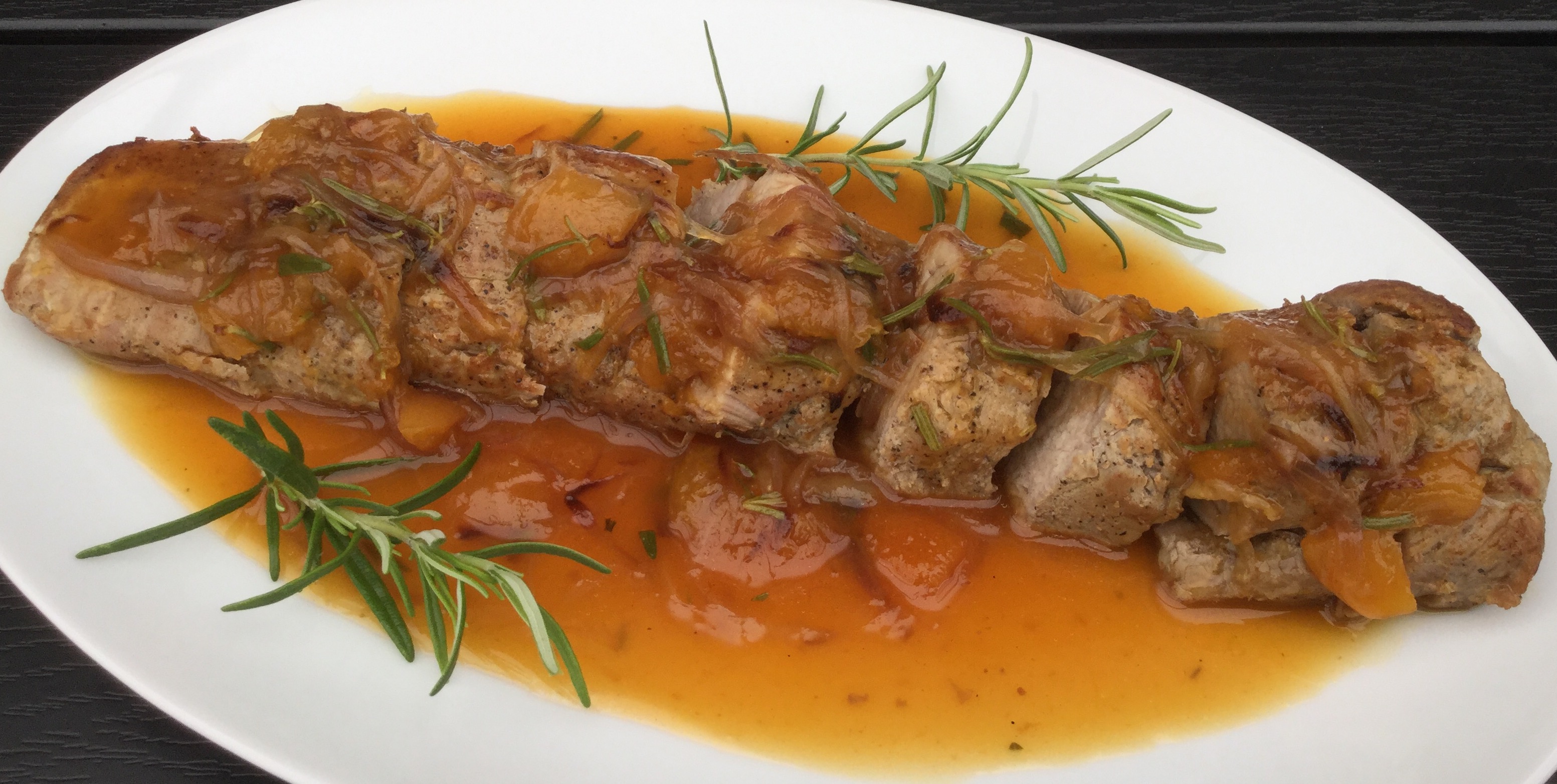 Skær mørbraden i skiver. Anret dem på et fad og kom saucen over. Pynt med rosmarinstilke.