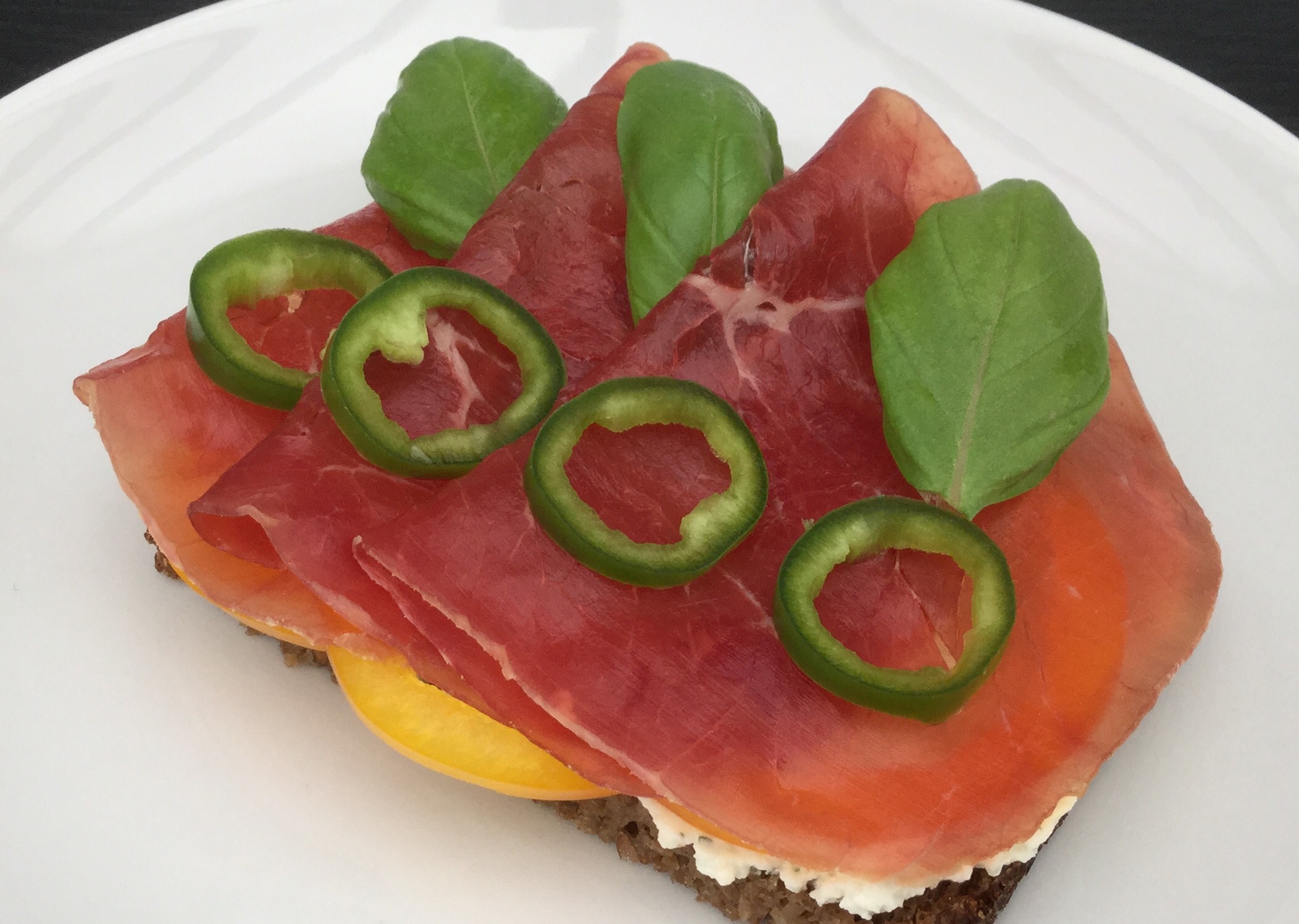 Smør hvidløgsost på rugbrødet. Læg ringe af gul peberfrugt og bresaolaskiver på. Pynt med ringe af Jalapeño og basilikumblade.
