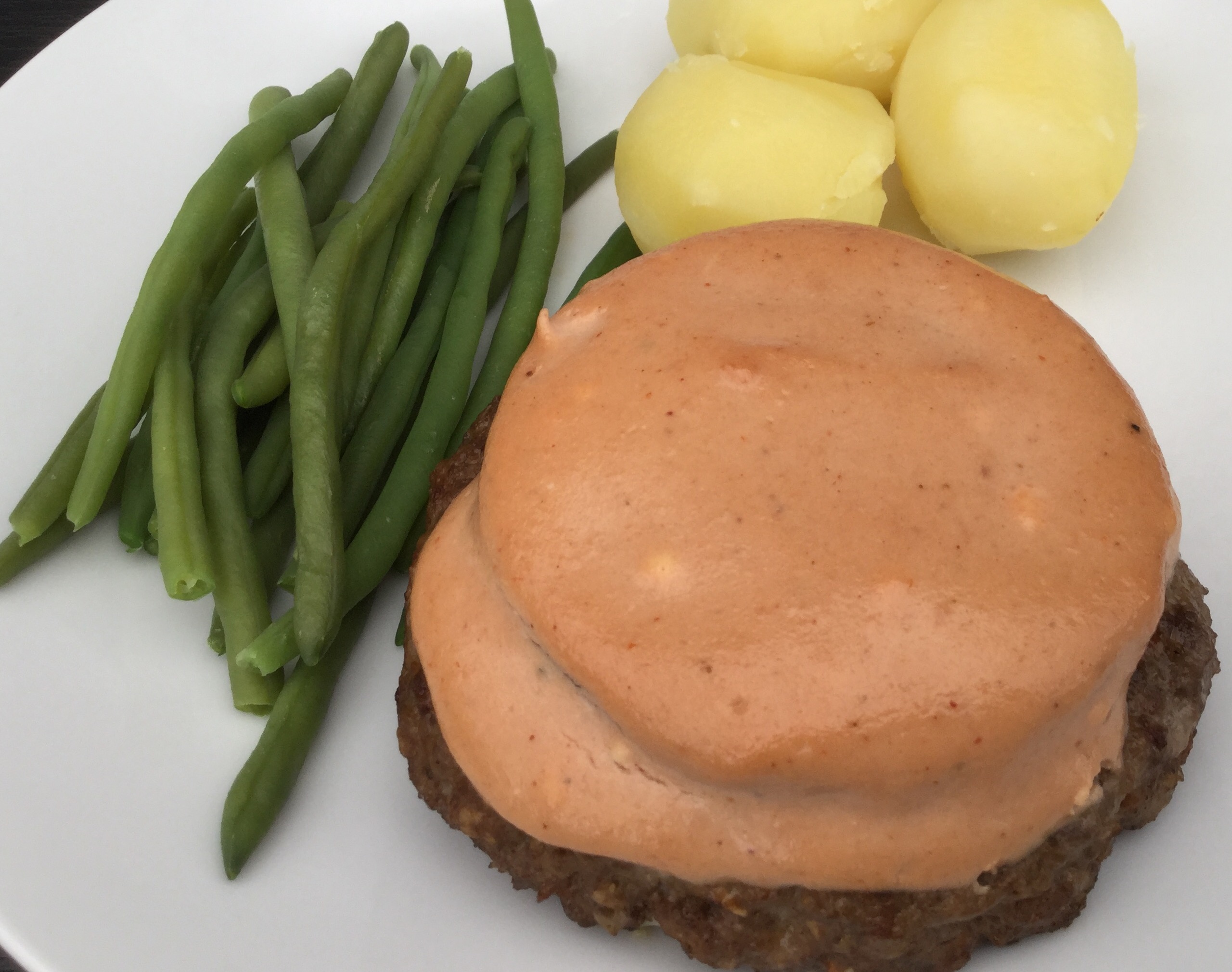 Rør farsen med æg, havregryn, paprika, salt og peber. Form farsen til 4 store bøffer og steg dem i olie på en pande. Læg dem i et ildfast fad.