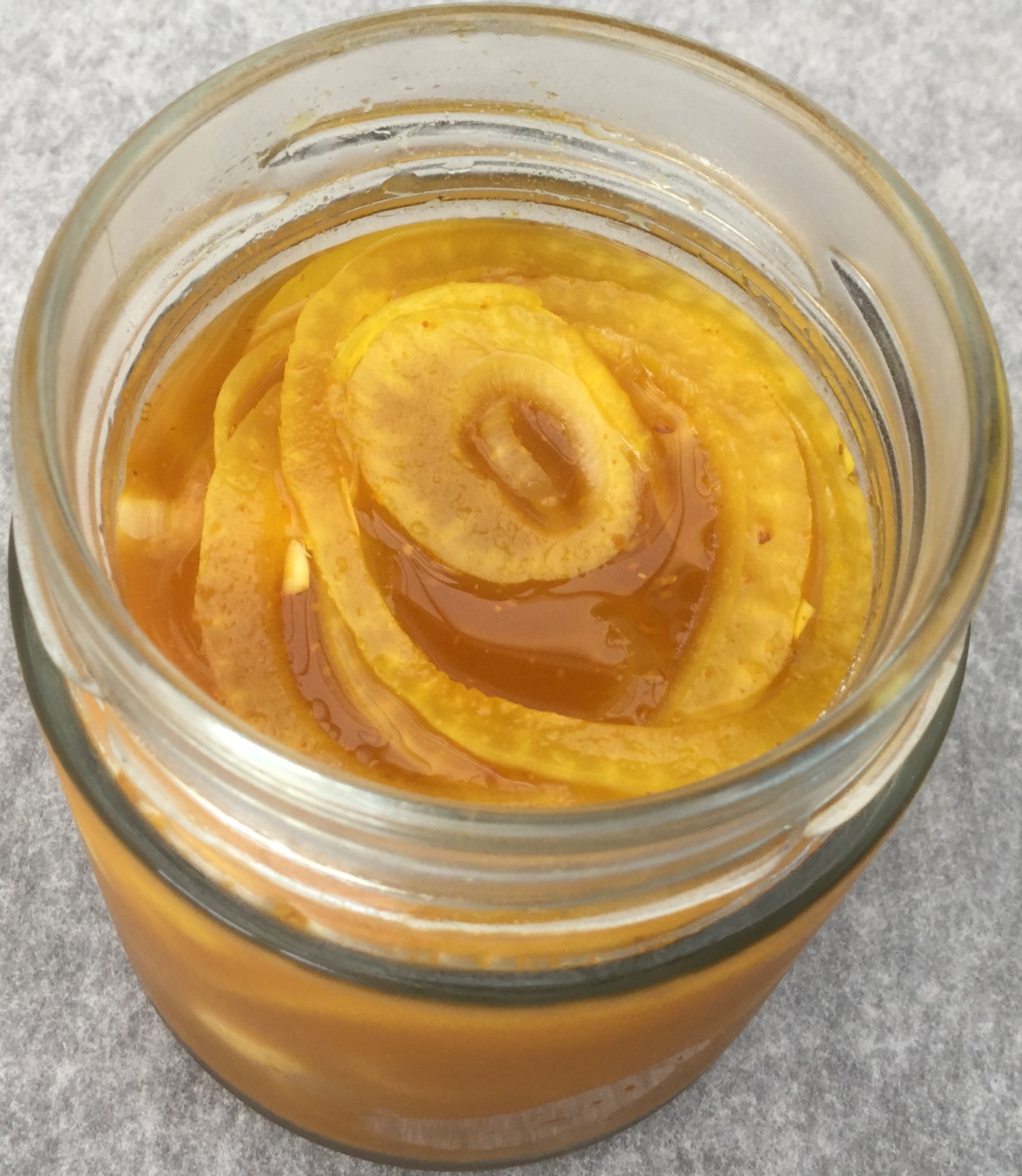 Skær løget i tynde skiver og læg dem i et rent skoldet glas. Kog juice, eddike, sukker og karry langsomt op. Lad det køle ned og hæld det over løgene. Luk glasset og lad det trække nogle timer eller natten over. Vend/ryst glasset så lagen fordeles på alle løgskiverne. Opbevares køligt.