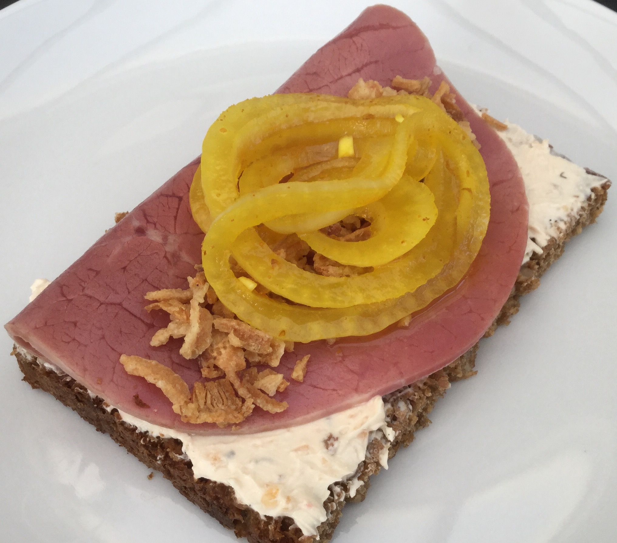 Smør Philadelphia på rugbrødet. Læg saltkød oven på. Pynt med ristede løg og karrysyltede løg.
