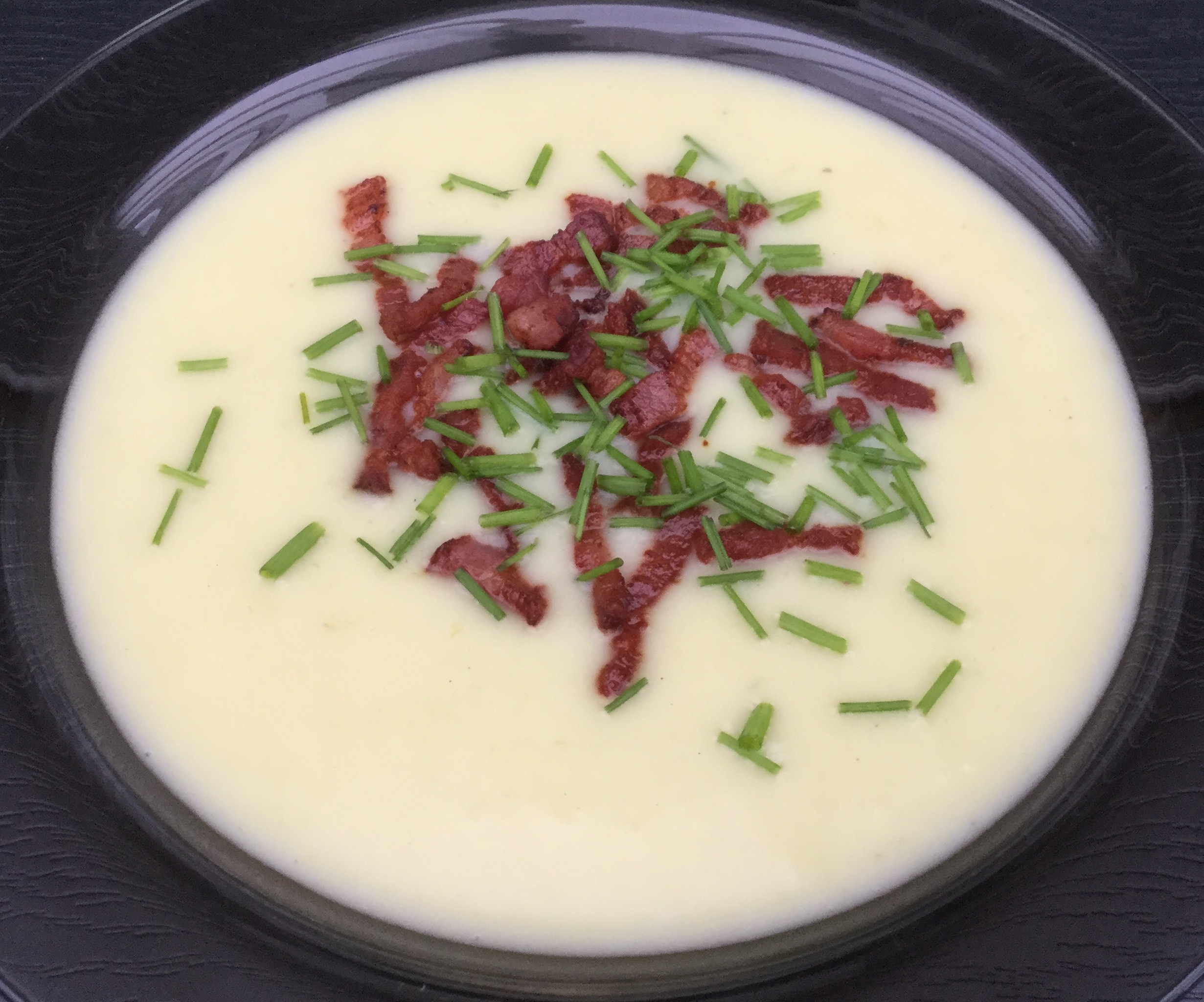 Fjern laurbærbladet når grønsagerne er møre. Blend suppen med en stavblender og tilsæt fløde. Tilsæt evt. lidt mælk for en tyndere suppe. Lad den koge op igen og smag til med salt, peber og citronsaft. Pynt med bacontern og purløg ved servering.