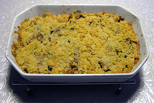 Mel og margarine smuldres sammen. Sukkeret blandes i. Blandingen drysses over æblerne. Bages i ovnen ved 200 grader i 30-40 minutter.