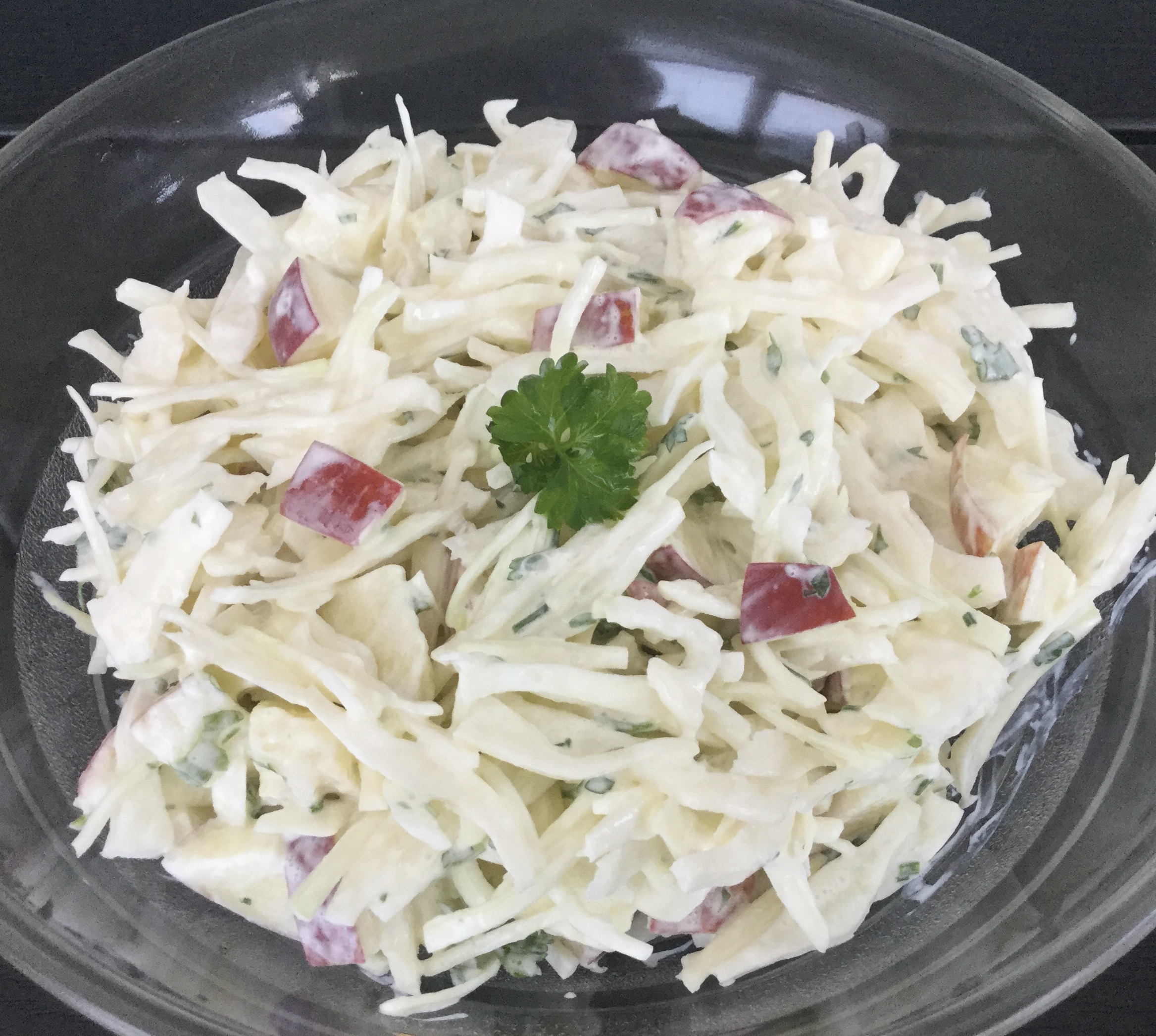 Rør creme fraiche med rørsukker og smag til med citronsaft. Hak persille og purløg og vend dem i dressingen. Hæld dressingen over salaten og bland godt.