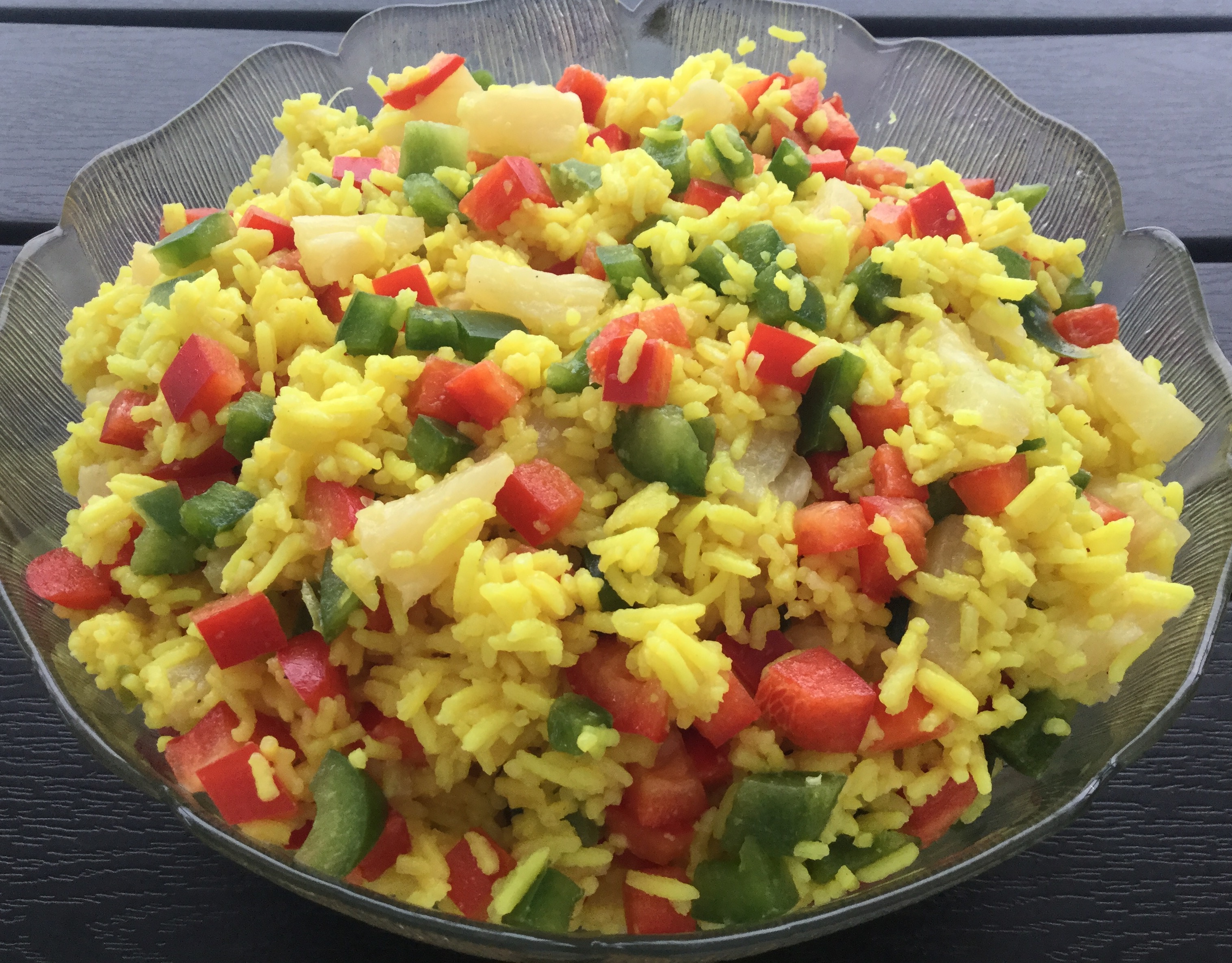 Skær peberfrugter og ananasringe i tern og vend dem i risene. Sæt salaten på køl indtil servering.
