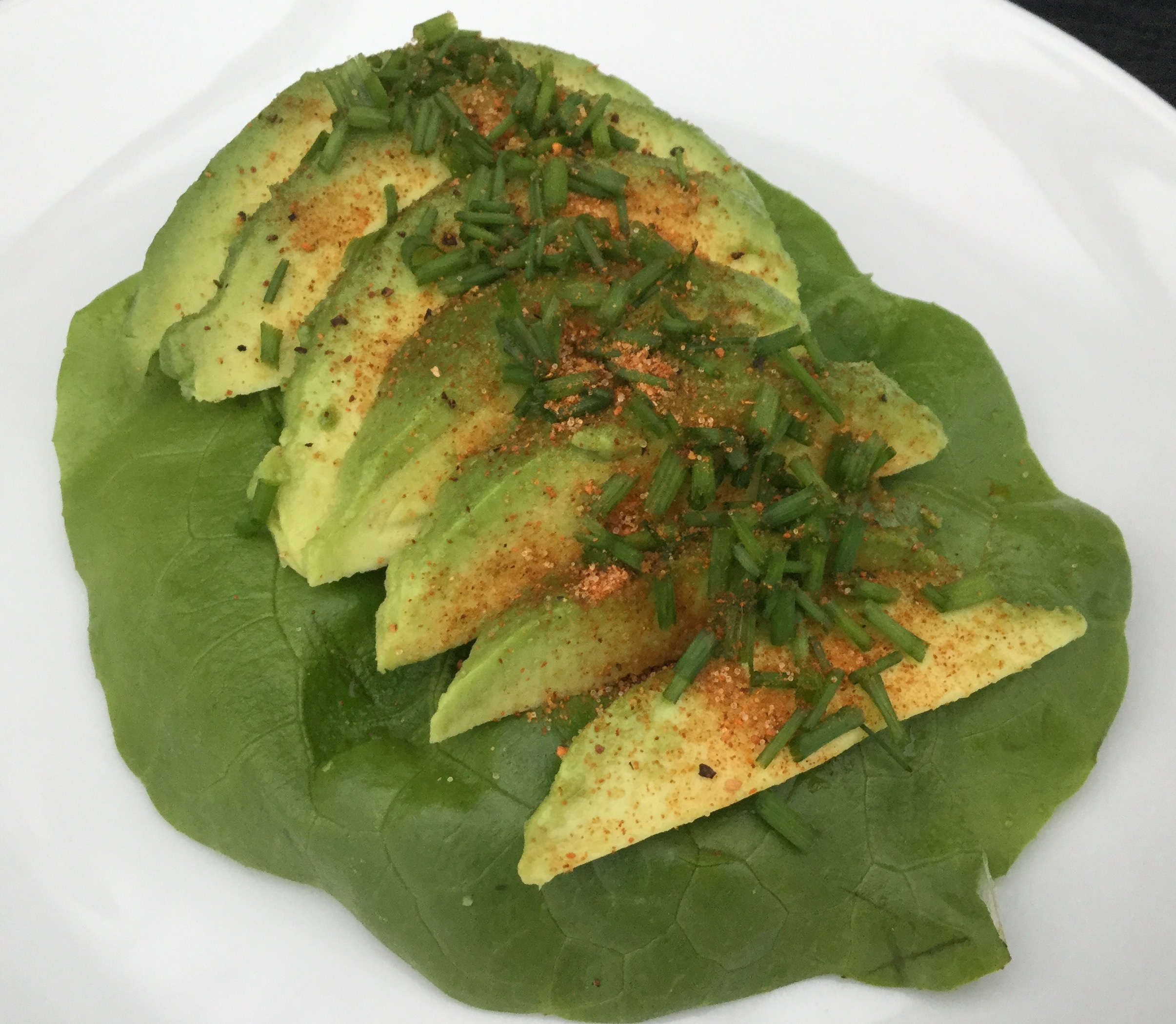 Læg salatbladet på rugbrødsskiven. Skær avokadoen i skiver og læg dem på. Snit purløget og læg det i en stribe på langs. Drys allroundkrydderi på. Server straks.