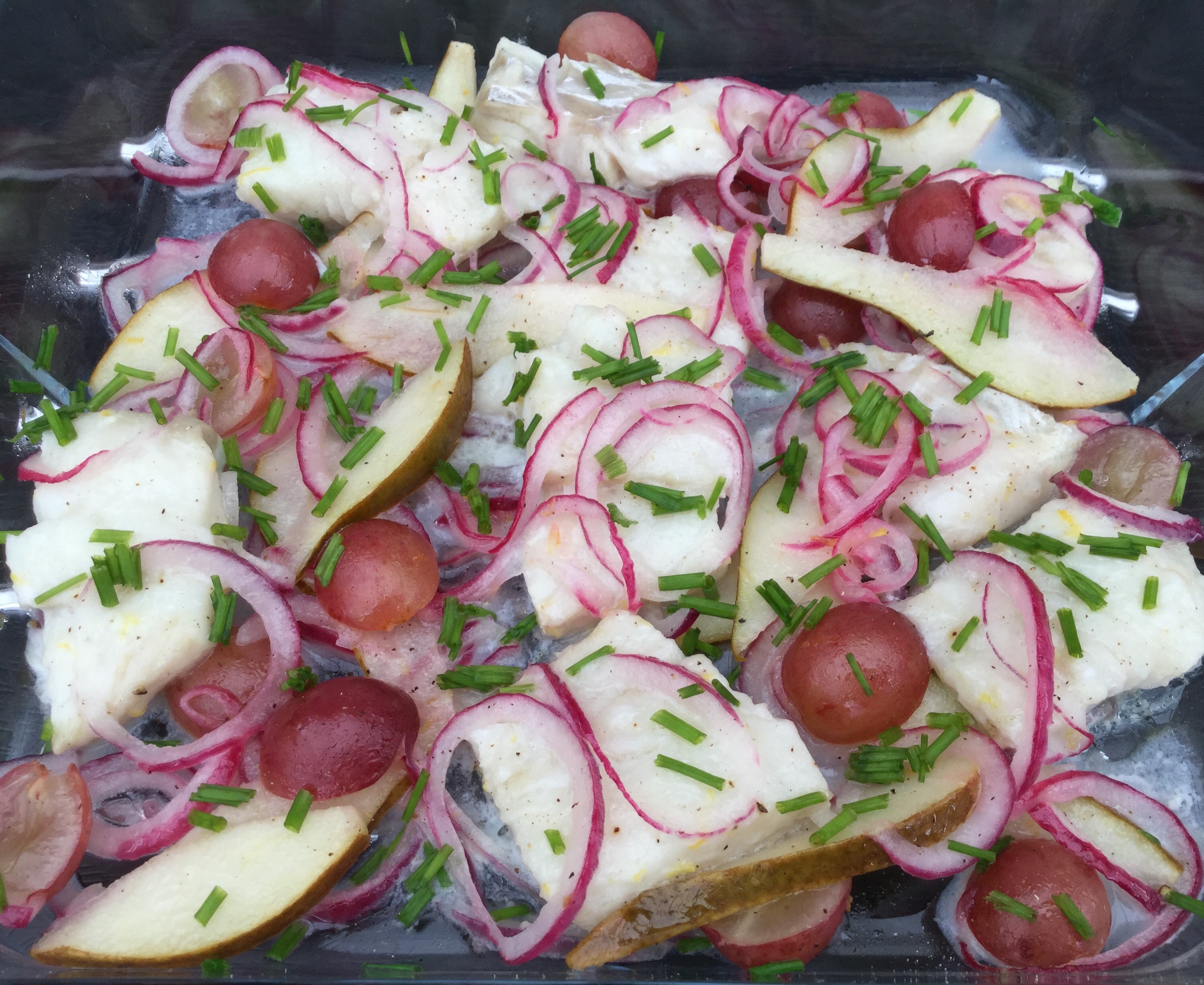 Vend torsk, løg, pære og vindruer i marinaden. Lad det trække mindst 30 minutter - gerne 2 timer på køl.