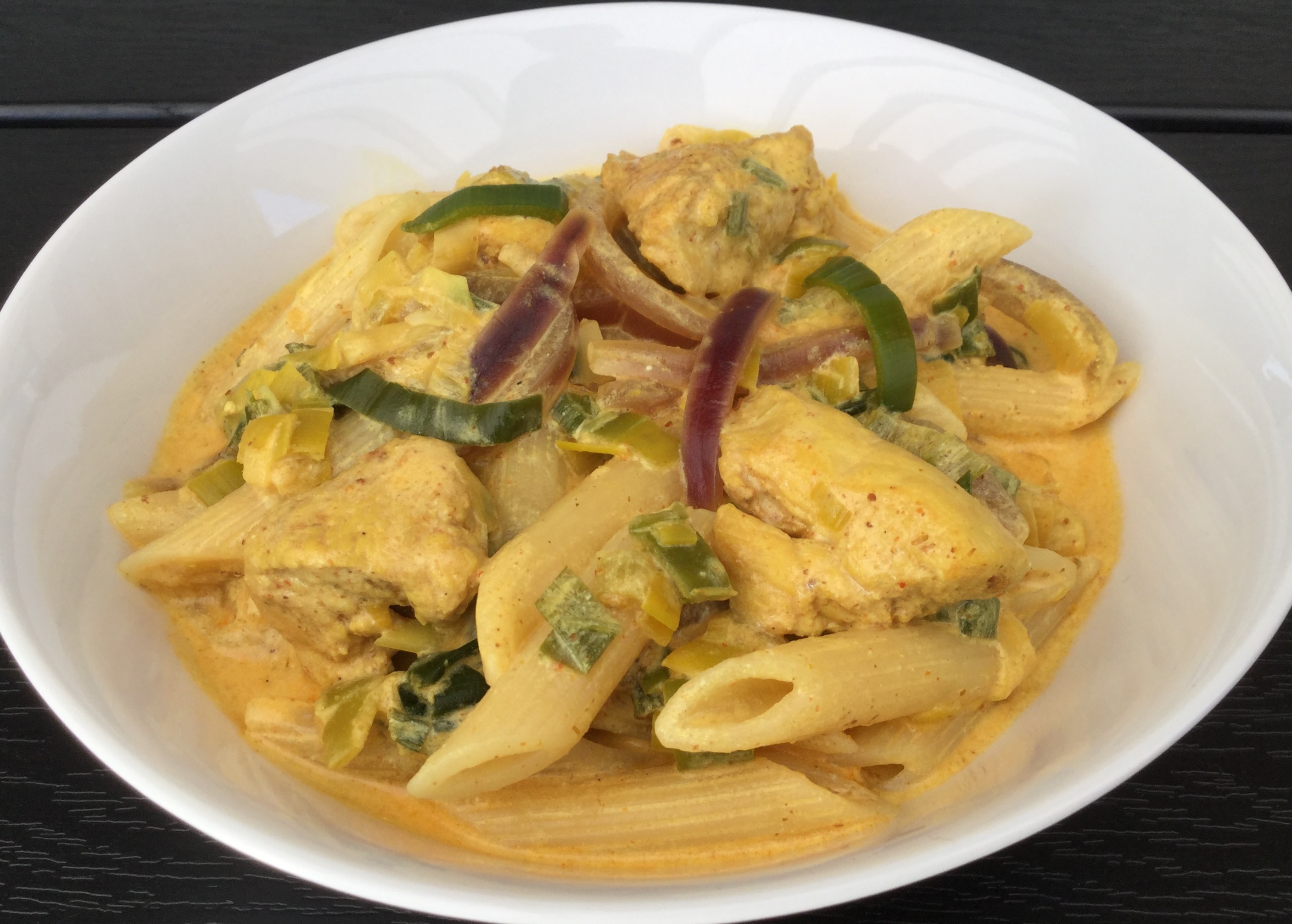 Skær kyllingefileterne i mundrette bidder og svits dem i olie. Kom krydderierne i og svits videre. Tilsæt rødløg og porrer og lad dem svitse med et par minutter. Tilsæt bouillon og lad retten koge til kyllingekødet er gennemstegt.
