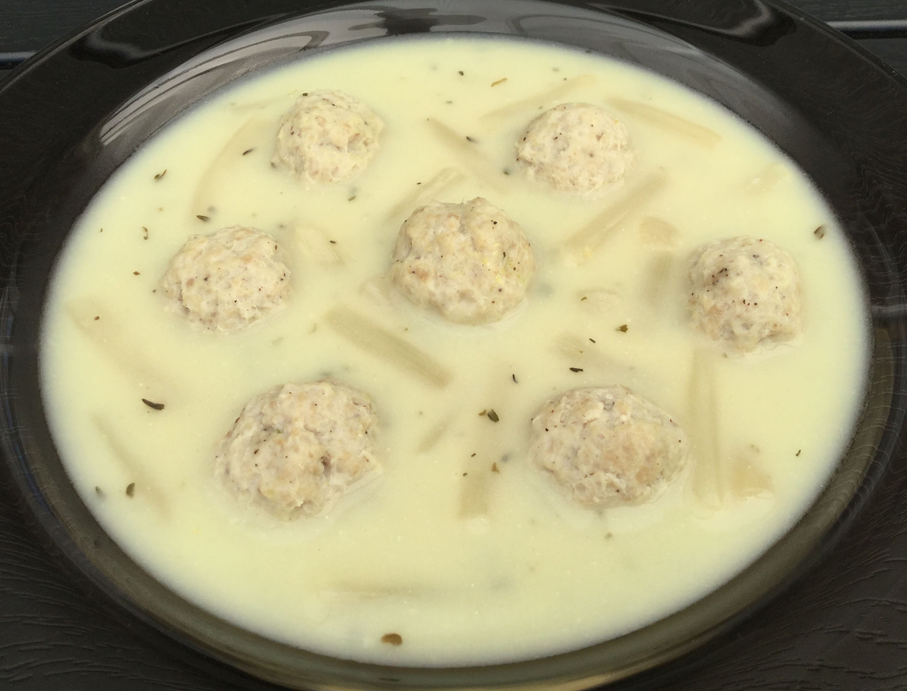 Tilsæt hvidløgsost og piskefløde. Smag til med salt. Kom aspargessnitterne i suppen og varm den igennem. Server suppen med kyllingekødboller.