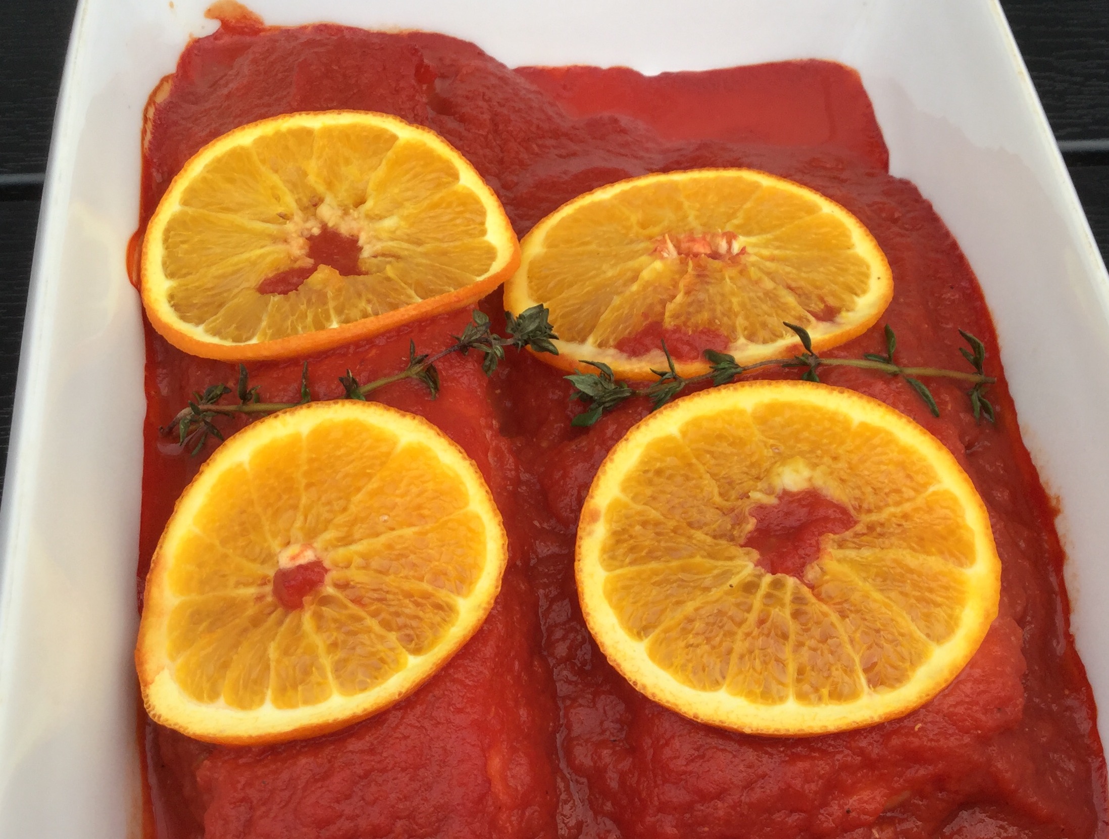 . Læg appelsinskiver og timiankviste på. Bag laksen i 10-15 minutter ved 175 grader varmluft