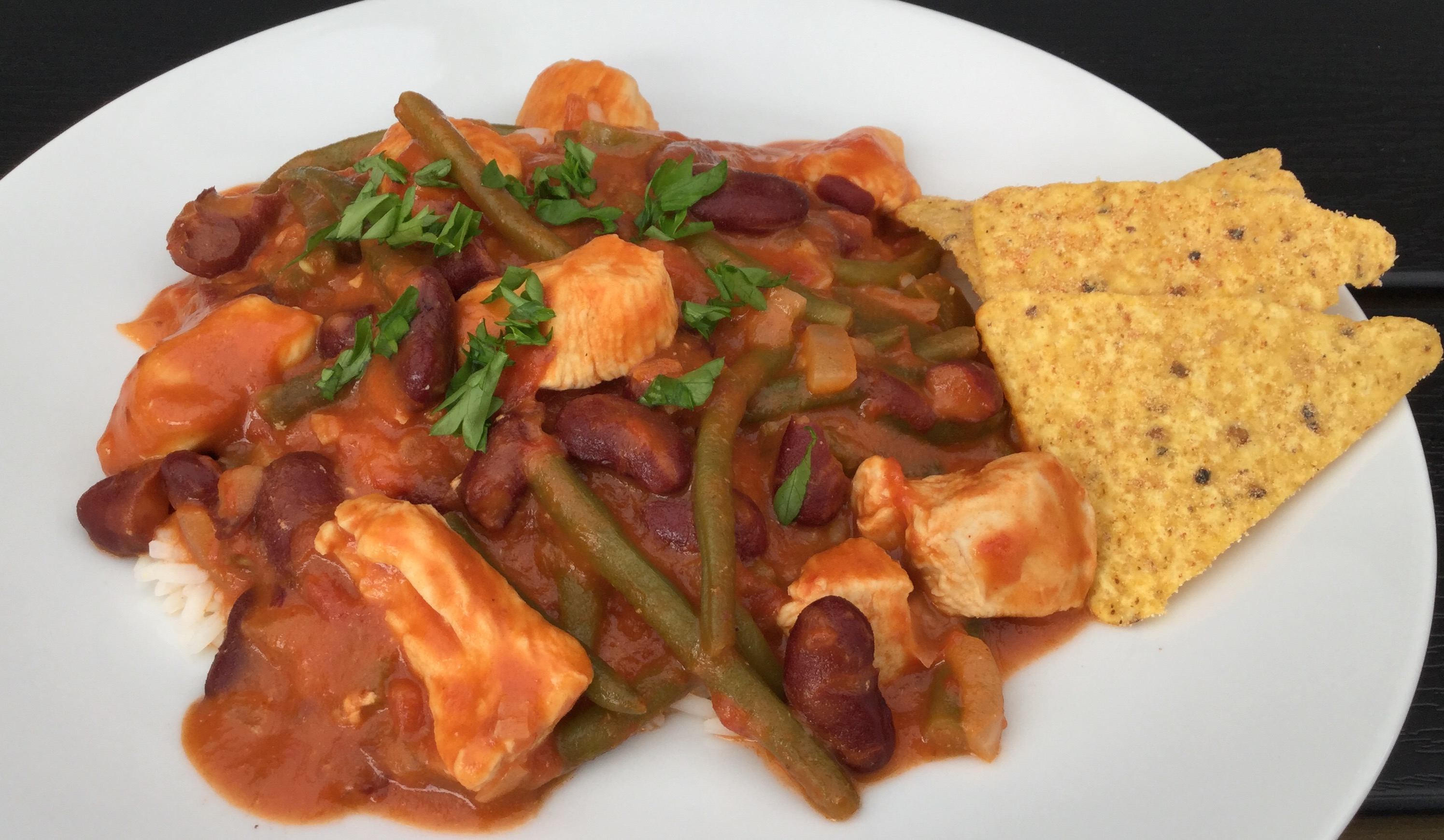 Skær løg og hvidløg i små tern. Skær peberfrugten i korte strimler. Grønne bønner skæres over på midten. Skær kyllingebrystfileterne i store tern.