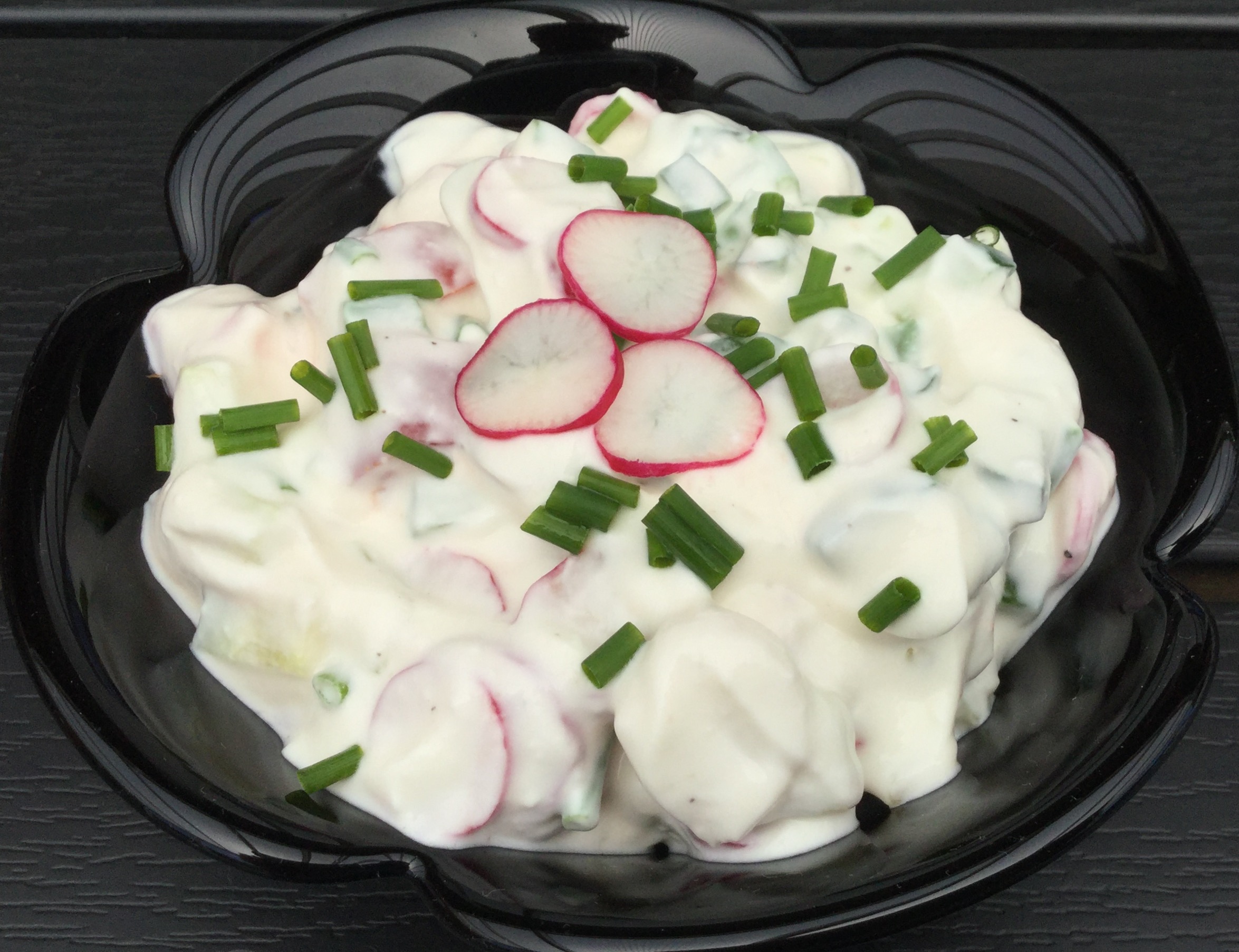 Vend grøntsagerne i dressingen. Pynt med radiseskiver og purløg.