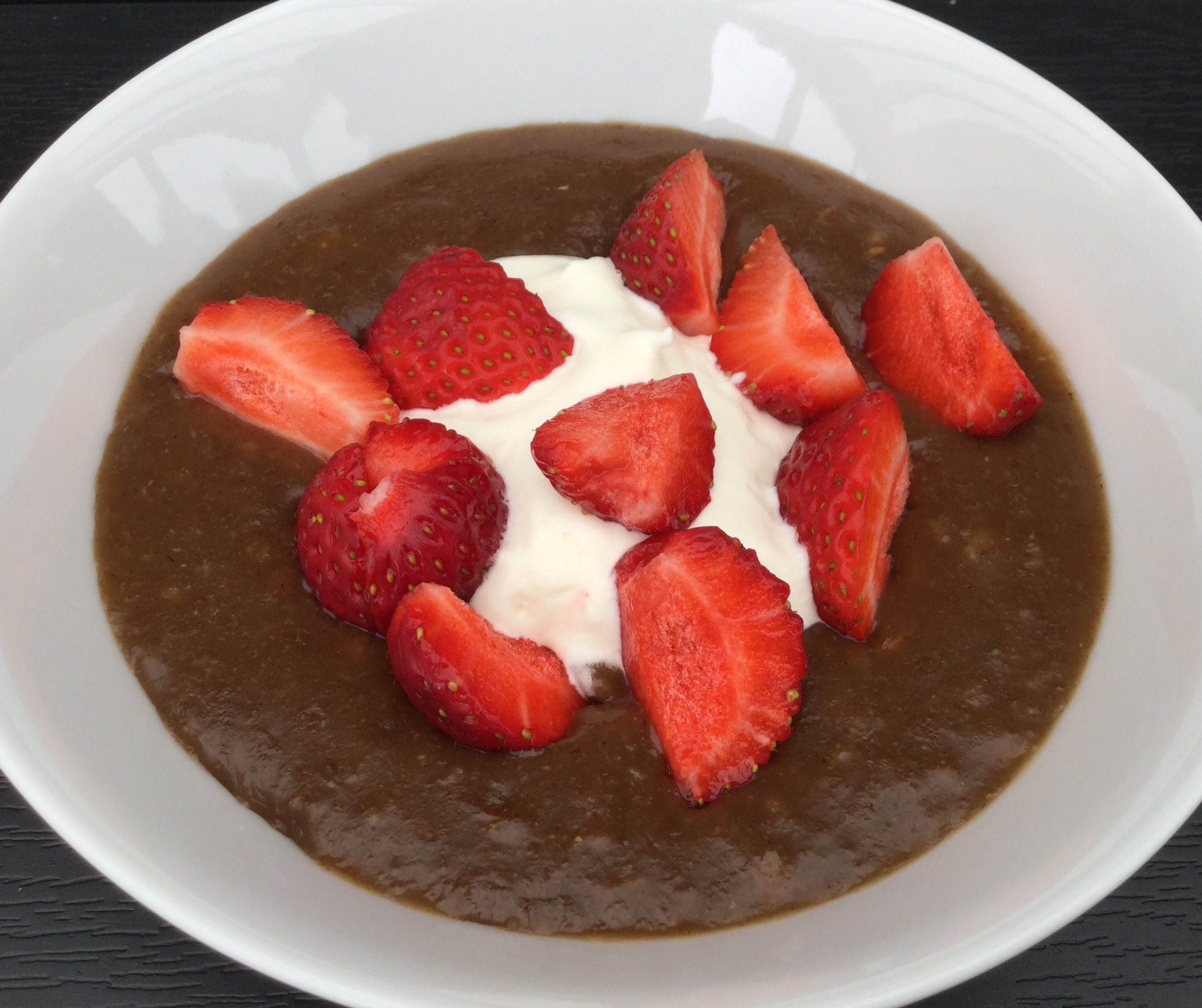 Anret grøden i dybe tallerkener eller skåle og top med en stor spsk. skyrflødeskum og friske bær.