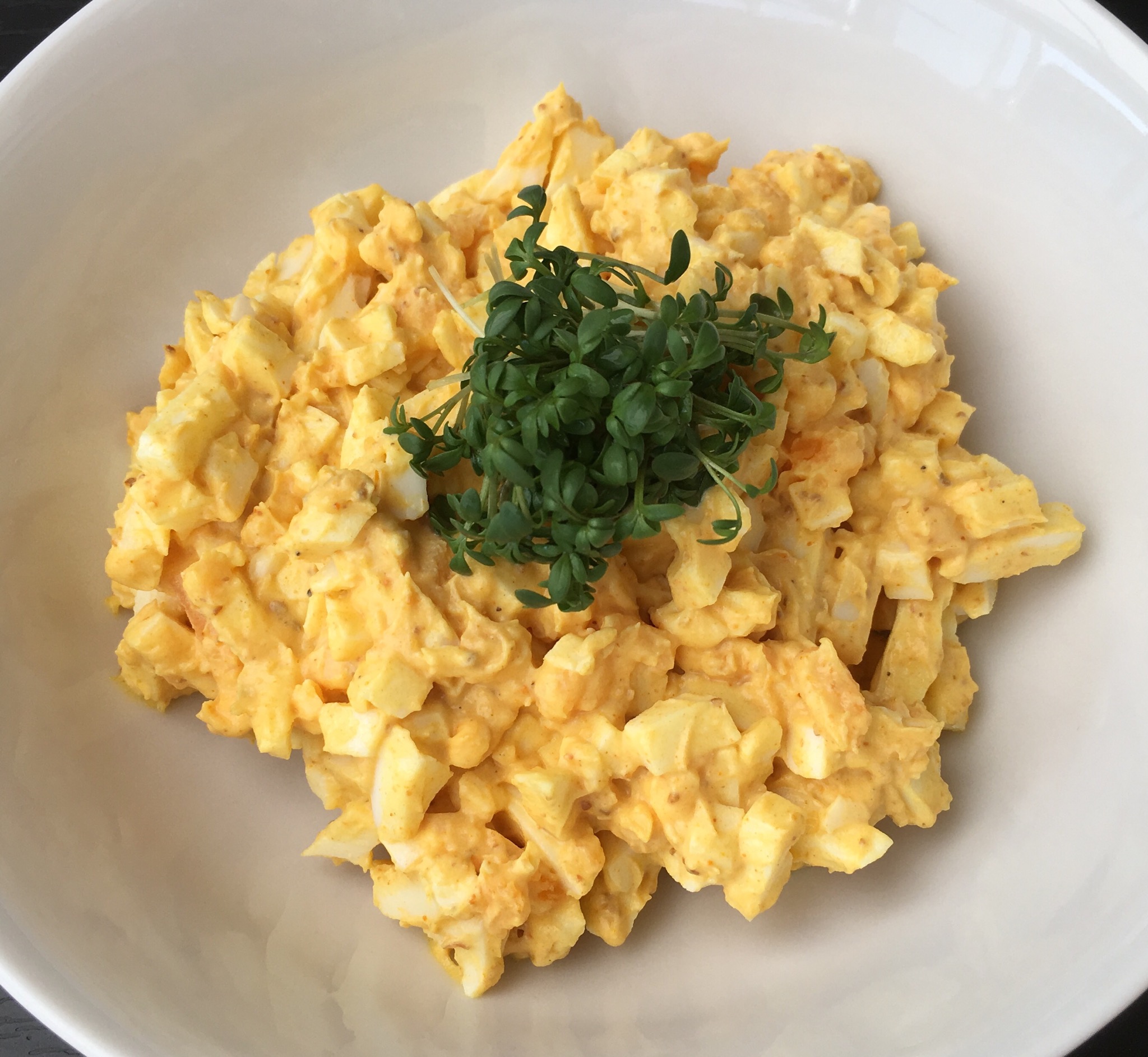 Rør mayonnaisen med krydderier og salt. Bland de hakkede æg i dressingen. Pynt med karse ved servering.