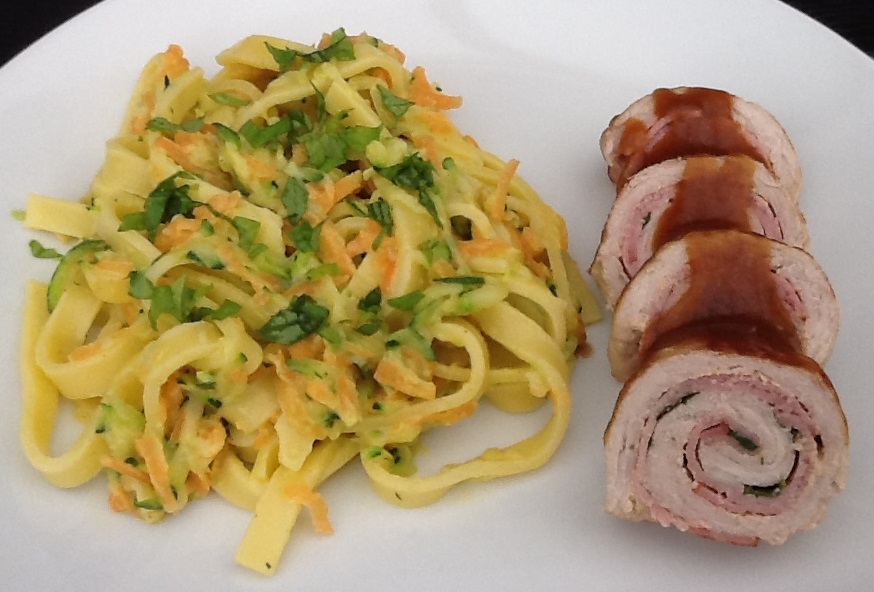 Bank schnitzlerne tynde med en kødhammer. Dup kødet tørt med køkkenrulle. Smør et lag sennep på schnitzlerne. Læg 3 skiver røget filet på hver schnitzel og drys med basilikum, peber og evt. lidt salt. Rul dem sammen og sæt kødnåle i. Brun rullerne på alle sider i olien. Hæld 1 dl vand ved og steg kødet under låg ved svag varme i 10 minutter. Tag rullerne op. Jævn skyen til sauce og smag den til. Fjern kødnålene og skær rullerne i tynde skiver.