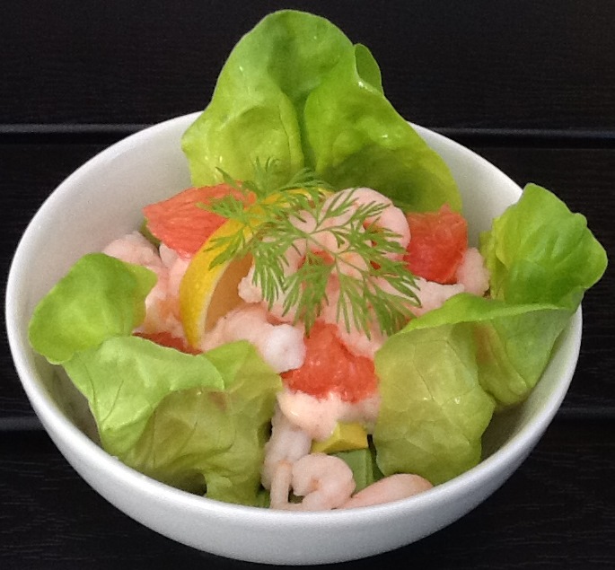 Læg de inderste salatblade i kanten af fire portionsglas. Fordel den snittede salat i bunden af glassene. Tag 12 af de pæneste rejer fra til pynt og fordel resten i glassene sammmen med avocado- og grapefrugttern. Rør alle ingredienserne til dressingen sammen og fordel den over reje-frugt-blandingen. Pynt til sidst med rejer, dild og citronbåde. Server forretten med flutes til.