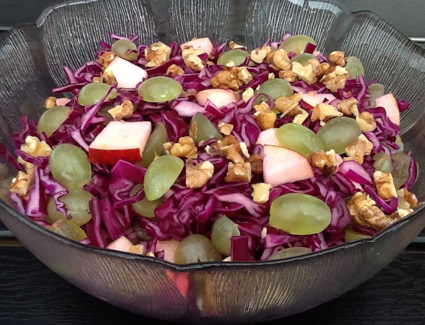 Snit rødkålen fint, halvér druerne og skær æblerne i tern. Bland det hele i en skål og hæld appelsinsaften over. Drys med valnødder og lad salaten trække i en ½-1 time, inden den serveres.