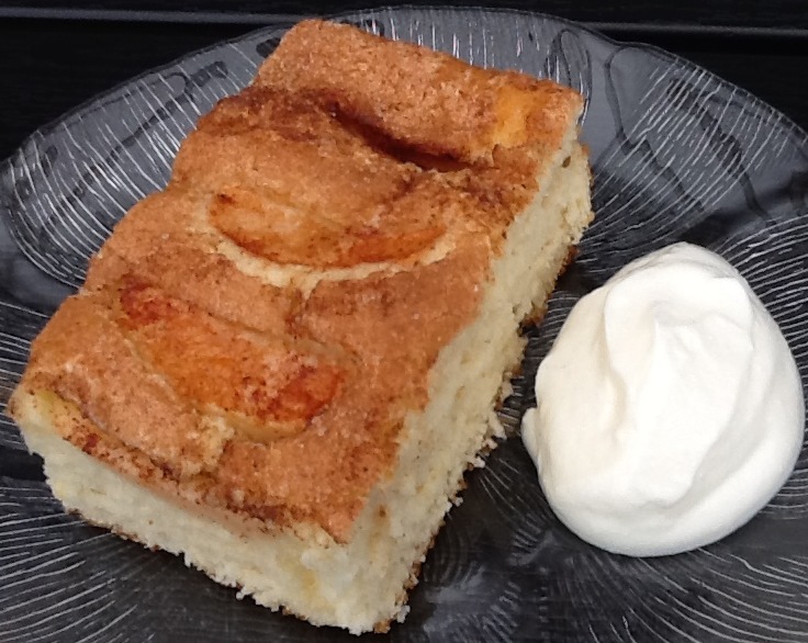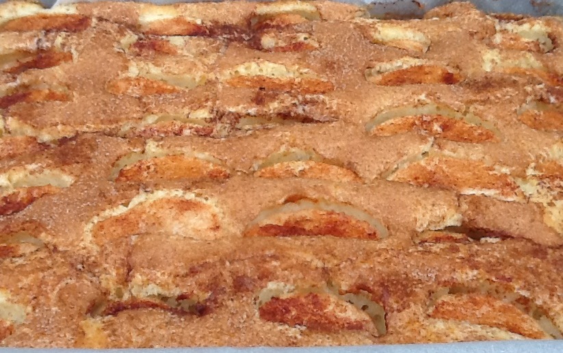 Æggene piskes skummende med sukkeret. Mel og bagepulver blandes og røres i skiftevis med mælken. Dejen hældes i en lille bradepande ca. 22 x 30 cm. De skrællede æbler skæres i både og lægges på. Sukker og kanel drysses over. Den smeltede margarine dryppes over til sidst. Bages 30-35 minutter ved 175 grader. Serveres lun med creme fraiche.