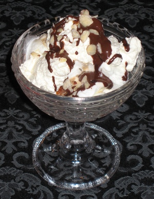 Kom derefter chokoladesauce og hasselnødflager ovenpå.
