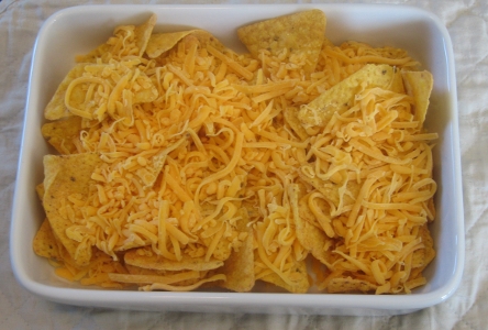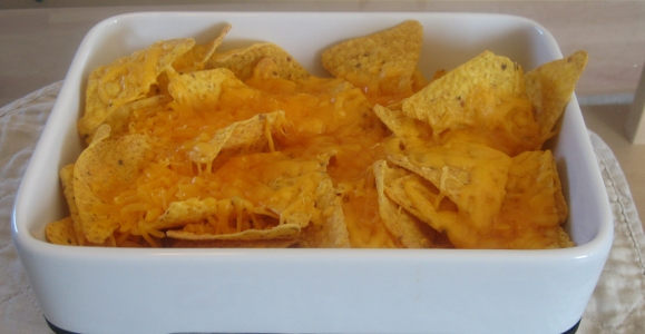 Kom nachosene i et ovnfastfad og fordel chedderosten over nachosene.