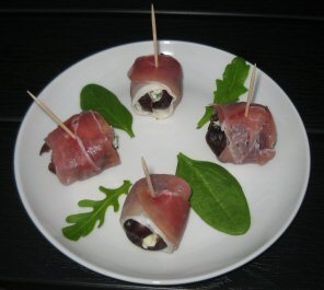 Åbn dadlerne forsigtigt og fjern stenen. Læg en lille teskefuld blåskimmelost ind i hver dadel og luk dem til igen. Skær serranoskinkeskiverne i smalle strimler og vikl dem om dadlerne.