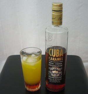 Cuba Caramel hældes i et højt glas. Fyld op med isterninger og appelsinvand.