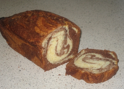 Kom skiftevis en spiseskefuld af den lyse dej og den mørke dej over i formen. Slut af med at føre en gaffel igennem dejen, så der dannes et marmoreret mønster.