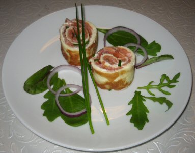 Pisk æg, fløde, salt og peber sammen. Bag to tynde omeletter på en slip let-pande og læg dem til afkøling på et stykke bagepapir. Smør omeletterne med creme fraiche og læg lakseskiverne ovenpå, så hele omeletten er dækket. Drys med rødløg og klippet purløg og rul dem sammen til roulader. Pak bagepapiret stramt omkring og læg dem i køleskabet indtil servering, mindst 30 minutter. Skær rouladerne i tykke skiver og server pyntet med lidt salat, løgringe og lun flute.
