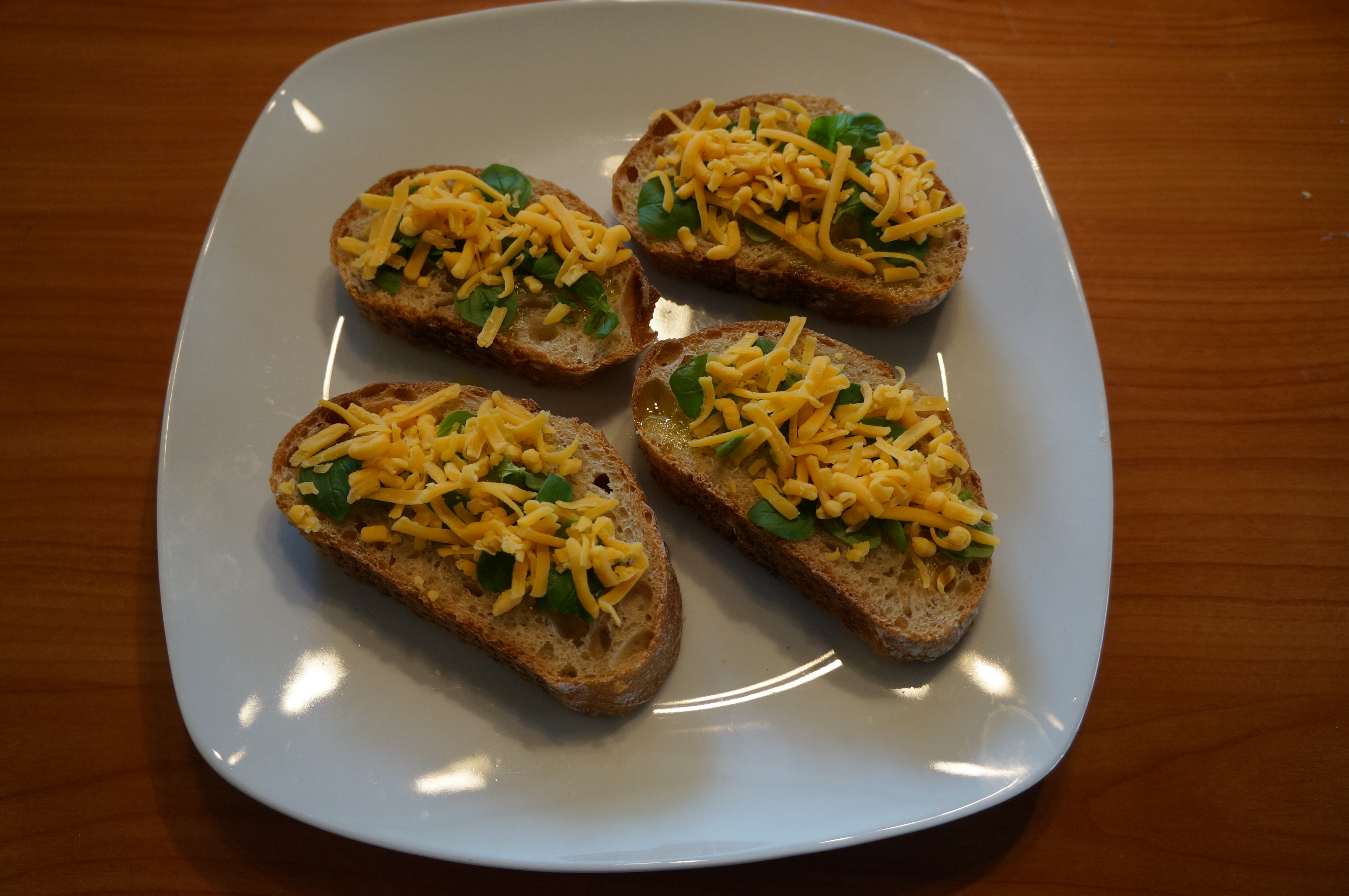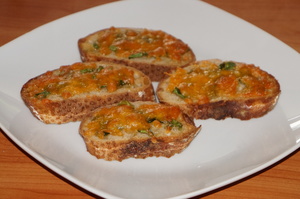 Kom nogle dråber olivenolie på hver skive flute og kom oregano over. Fordel derefter revet ost over hver skive flute. Bag dem på bagepapir i ovnen i ca. 10 minutter ved 200 grader eller indtil osten er smeltet og gylden.
