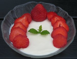 Hak chokoladen groft og læg den i en skål. Kog fløden op og hæld den over chokoladen og rør til den er smeltet. Lad blandingen køle noget af og bland forsigtigt yoghurten i. Rør til det er en jævn ensartet masse. Fordel blandingen i portionsskåle og stil dem i køleskabet mindst 2 timer. Pynt med jordbær, som er skåret i skiver og lidt citronmelisse. Server flere jordbær til.