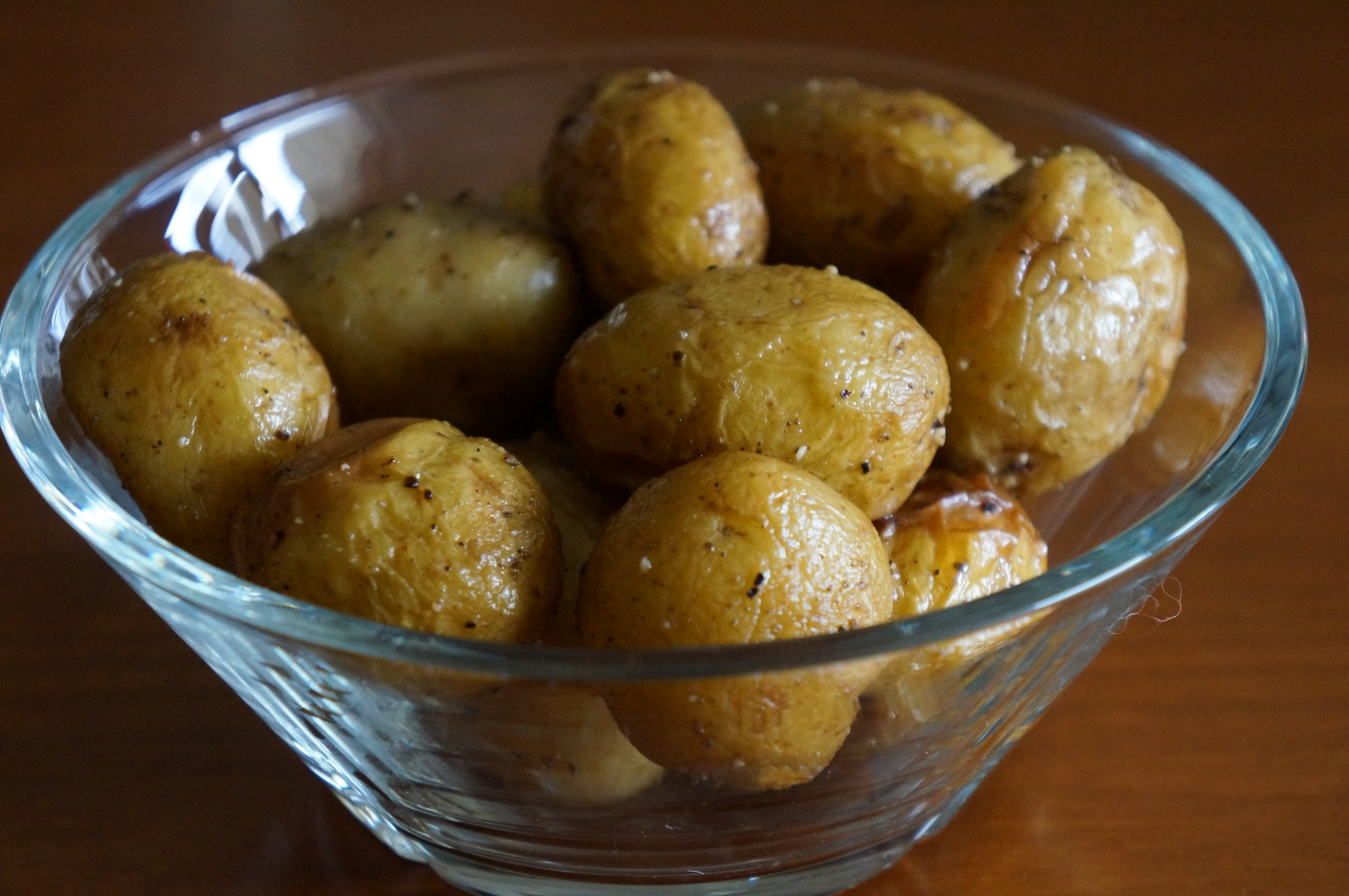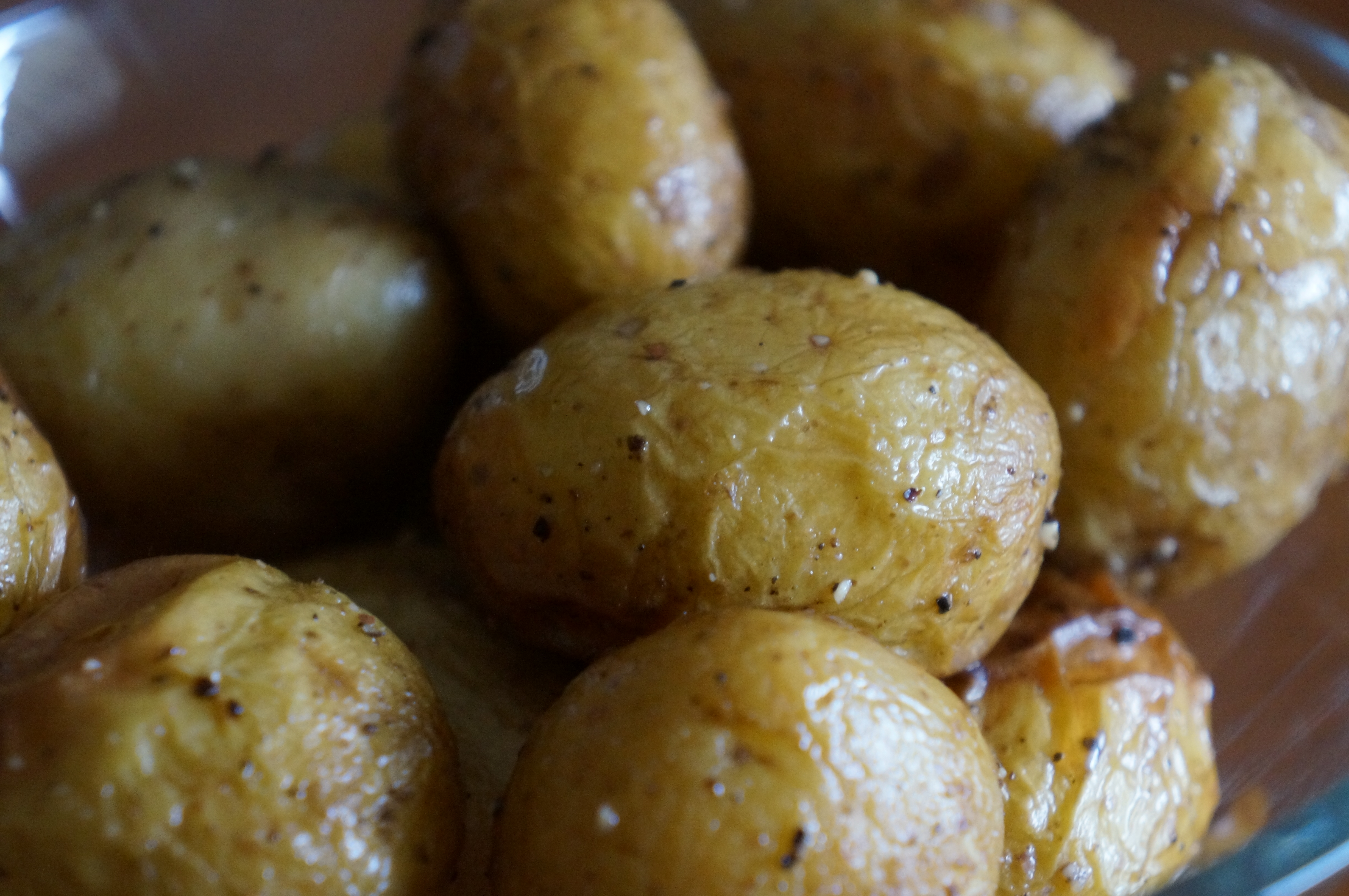 Skrub og vask kartoflerne og kom dem i en lille frysepose. Hæld olie i posen og gnid kartoflerne ind i olien. Kværn groft salt og peber i posen og fordel det godt på kartoflerne ved at gnide kartoflerne godt rundt i posen med hænderne. Læg kartoflerne på en bradepande med bagepapir. Bag dem i ovnen i 30 minutter på 200 grader.