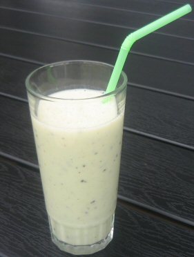 Skræl kiwierne og blend dem sammen med banan, hyldeblomstdrik og tykmælk. Server straks.