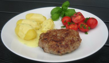 Skræl kartoflerne og riv dem groft. Løget rives fint. Begge dele kommes i farsen. Herefter kommes æg, basilikum, salt og peber i. Farsen røres godt. Formes til bøf og steges i margarine på panden.
