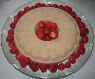 Pisk æggeblommer, flormelis og vanillesukker luftigt. Smelt chokoladen over vandbad og rør den langsomt i æggemassen. Tilsæt Grand Marnier og lad det køle lidt af. Pisk fløden stiv og vend den i blandingen. Kom isen i en form, og sæt den i fryseren i ca. 6 timer. Pynt med jordbær.